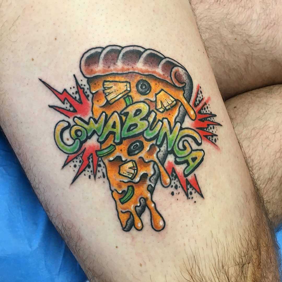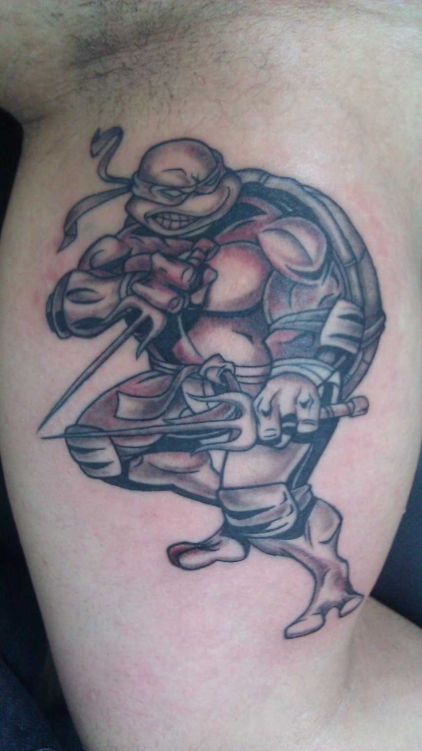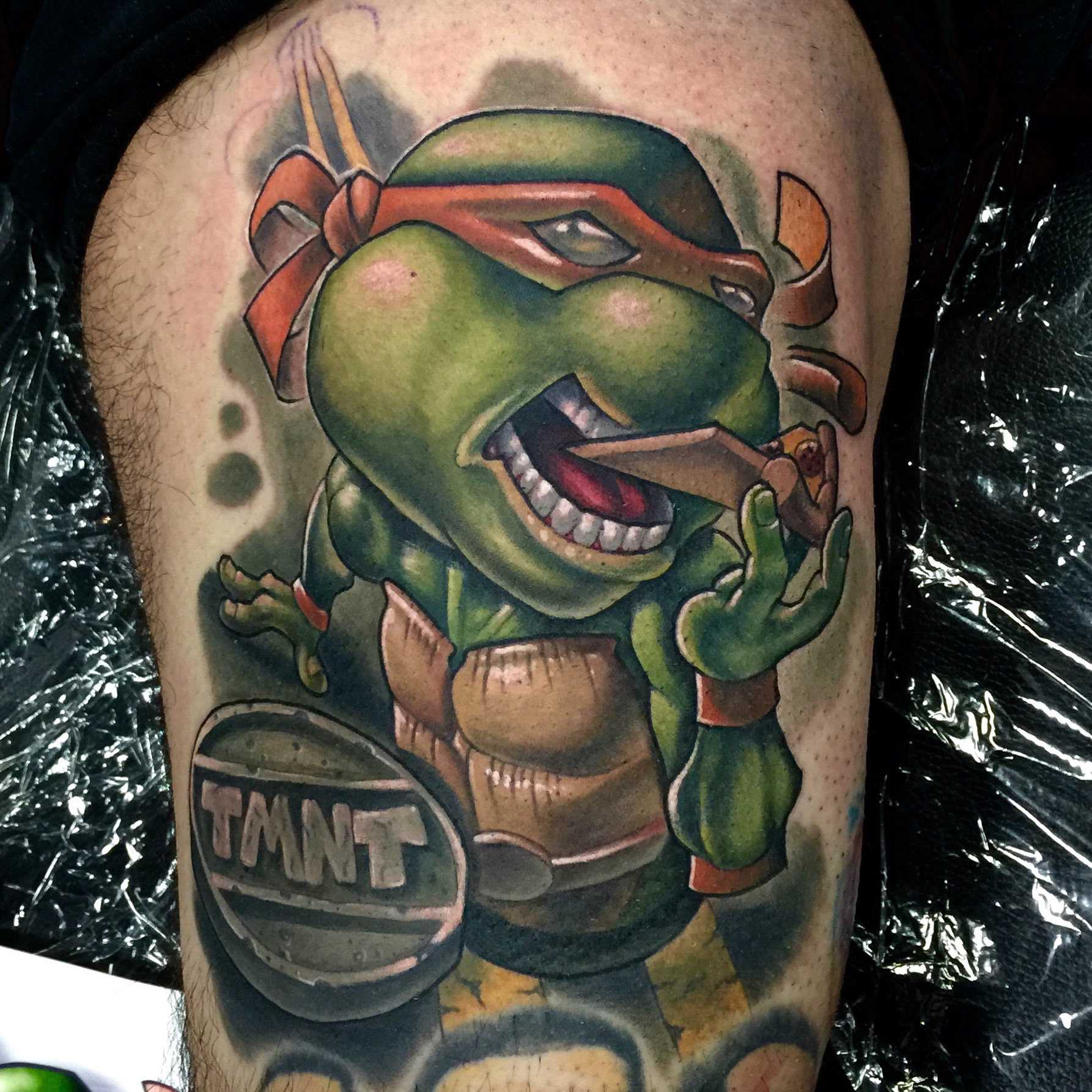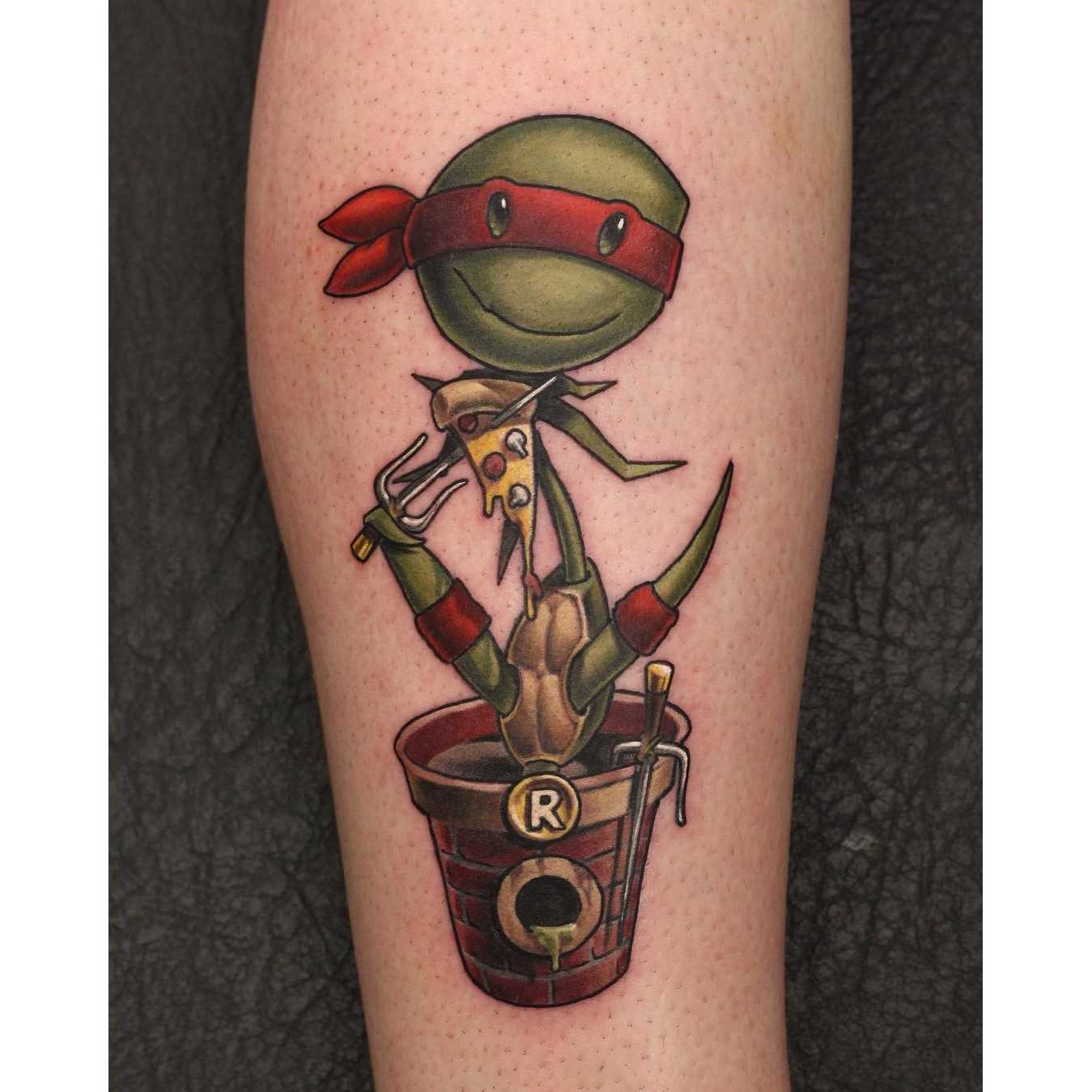 14. Quirky TMNT Tattoo: Imagine a design where Michelangelo is eating a pizza slice with your favorite toppings or Raphael in a meditative yoga pose. These designs reflect personal quirks while staying true to the TMNT theme.
