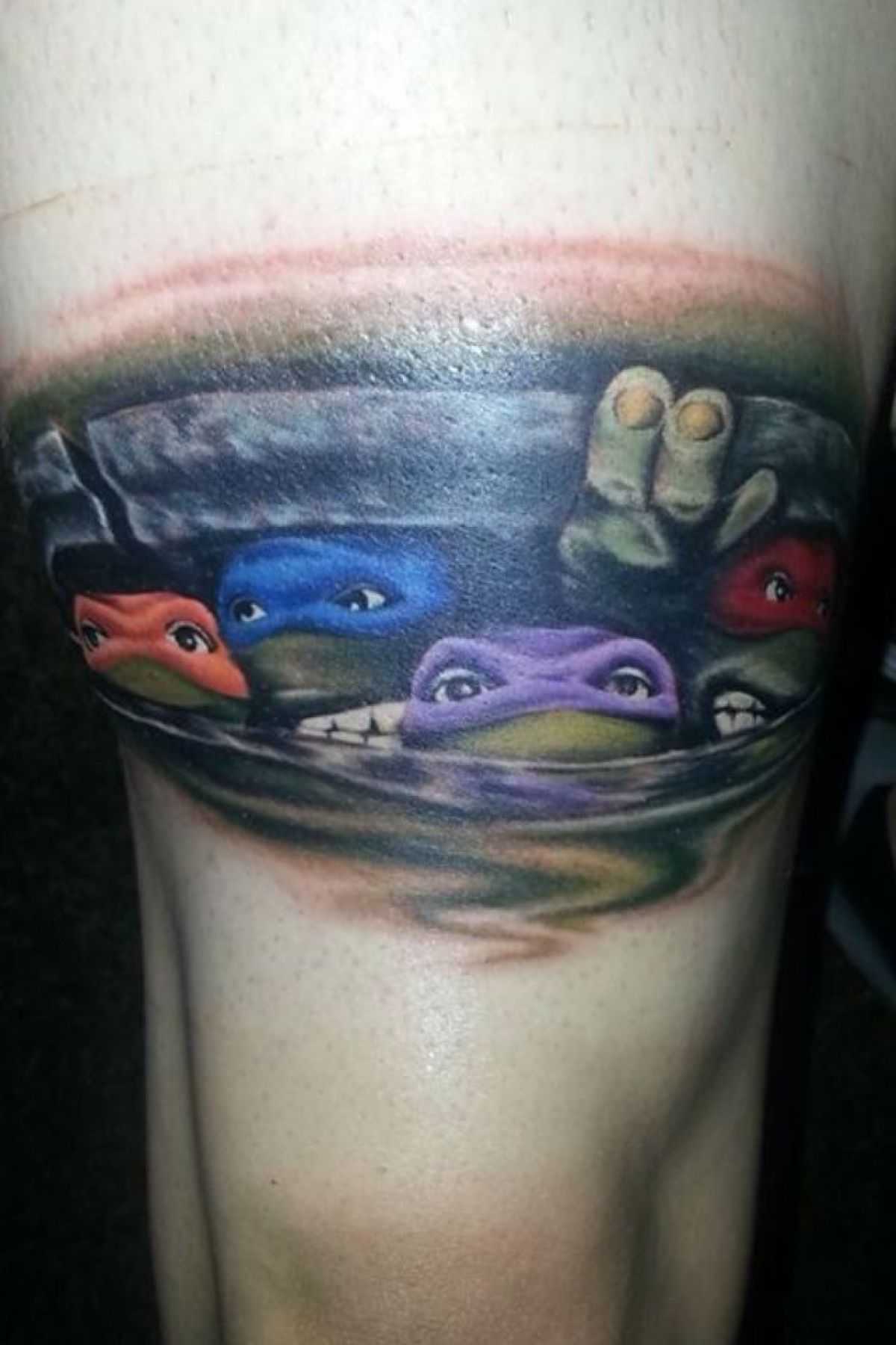 10. Watercolor: Watercolor tattoos have become increasingly popular in recent years, and it’s not hard to see why. This design would incorporate bright and vivid colors that blend like watercolors. A Ninja Turtle watercolor tattoo could showcase the turtles in action or even just a colorful portrait.