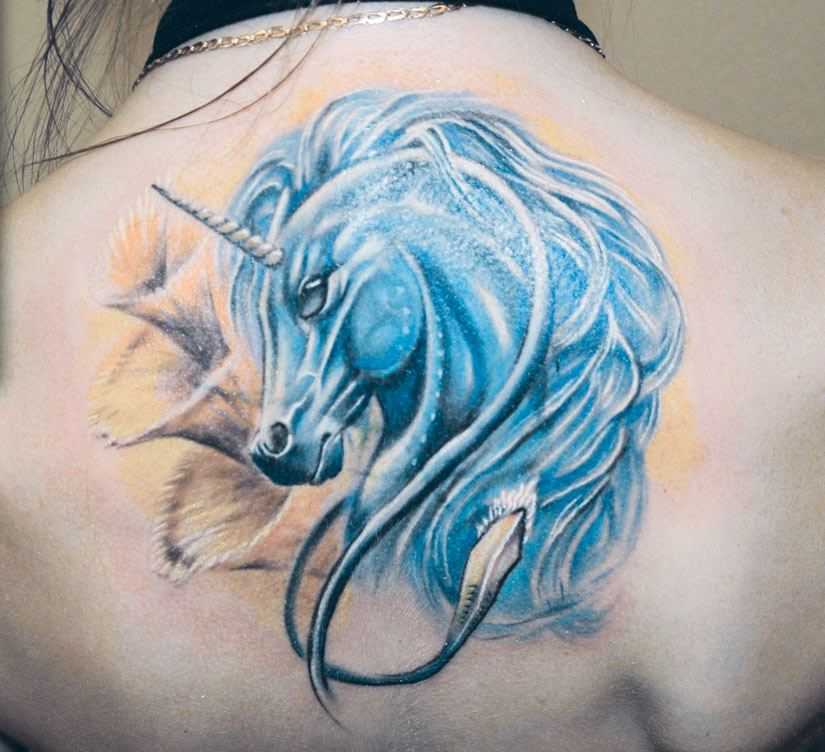 Разнообразные мифические существа, в том числе единороги – одни из самых популярных изображений для татуировок. Наиболее часто можно увидеть рисунок белого коня с рогом на лбу, а также с глазами синего цвета.