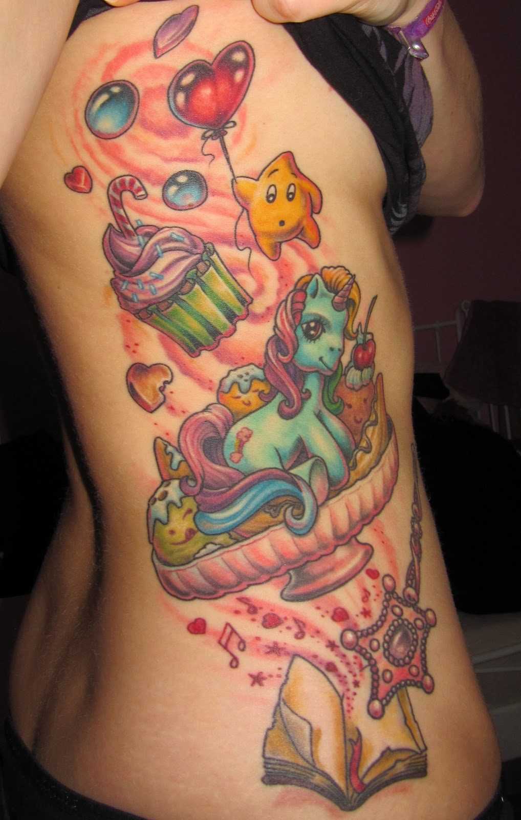 Нередко девушки выбирают тату в виде мультяшного персонажа. В таком случае они зачастую миниатюрные и выполнены в цветном варианте. Смотрятся данные тату очень мило, но перед нанесением рекомендуем взвесить все «за» и «против» такого выбора.