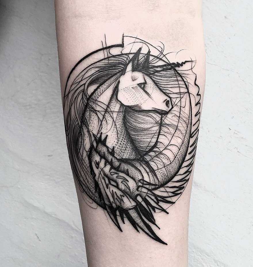 Мифический конь являлся спутником магов и волшебников, жизнь которых он защищал. Тату с этим необычным животным считается мощным оберегом от врагов и злых козней.