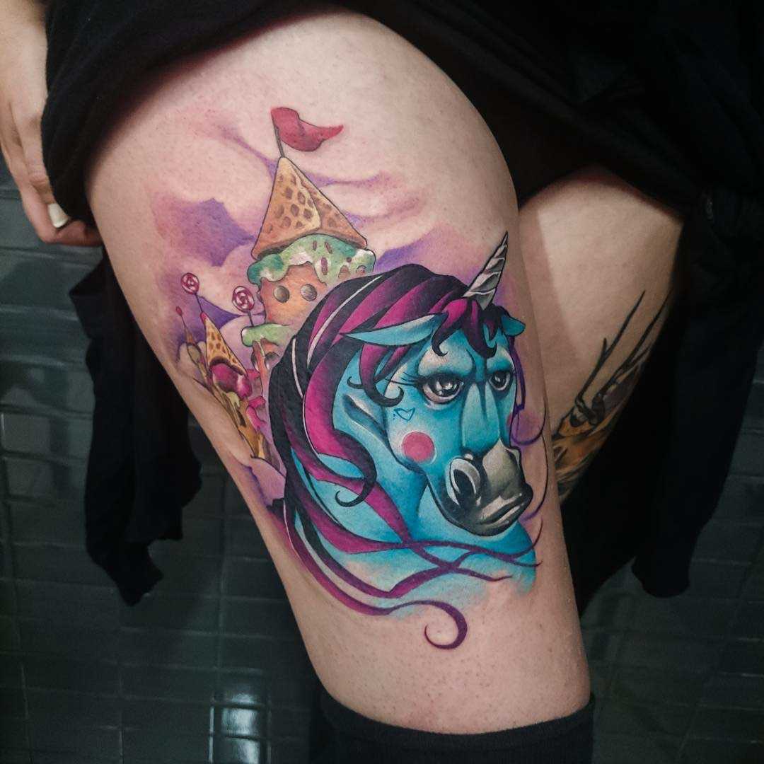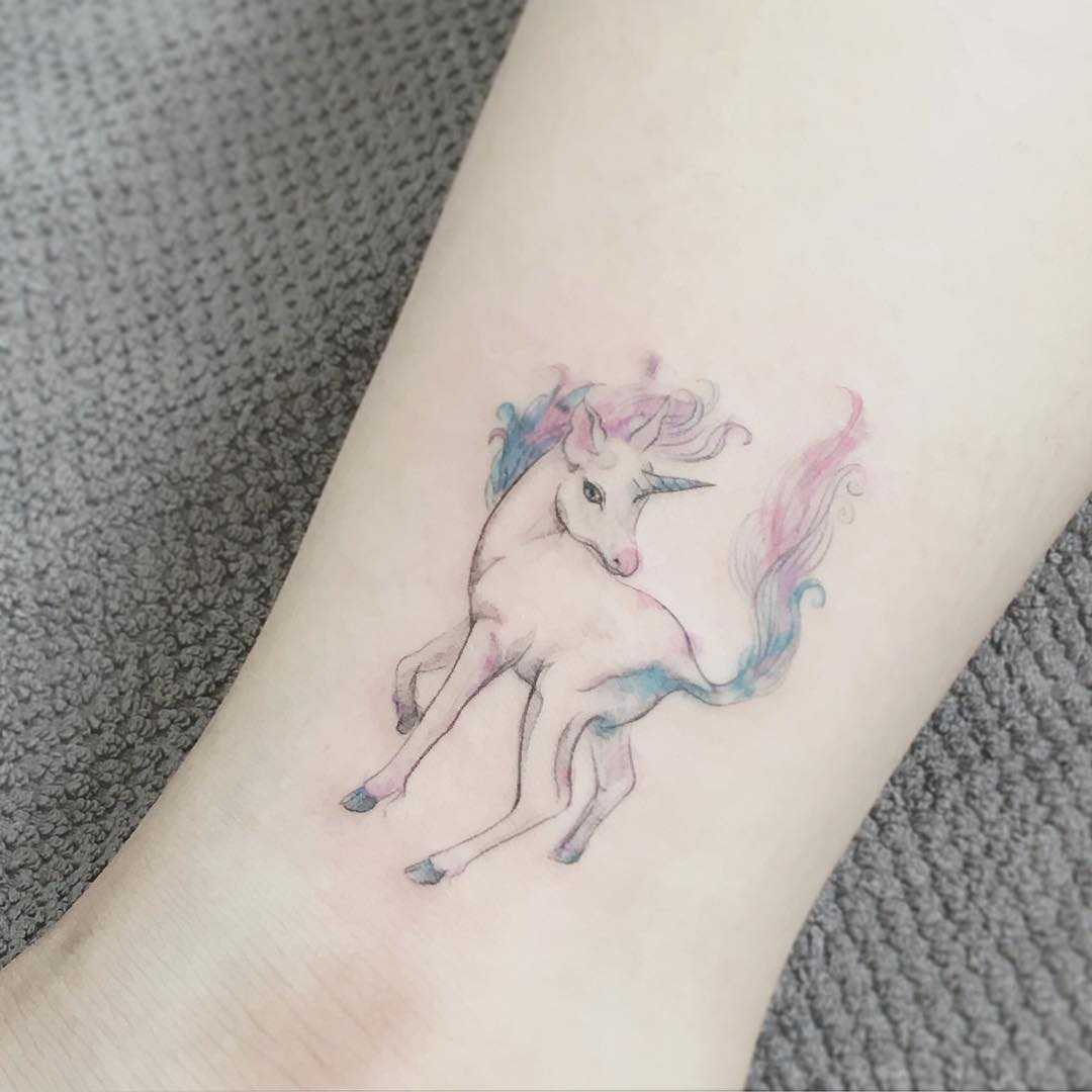 Ну и, конечно же, нельзя не отметить акварельный стиль нанесения тату. В таком случае единорог всегда получается особенно красивым благодаря цветным акцентам и деталям рисунка.