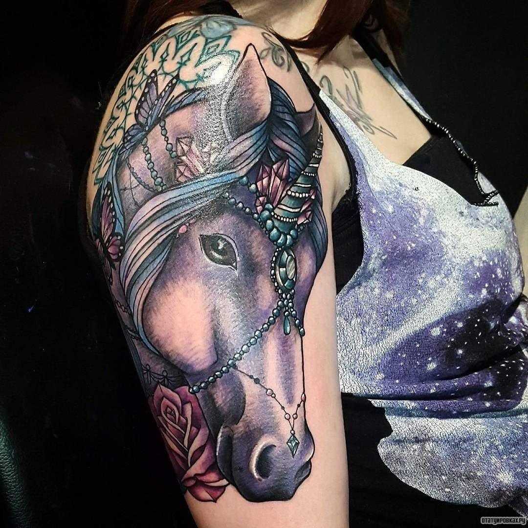 Девушки обычно предпочитают изображать это мифическое непарнокопытное в ярких цветах. Часто рисунок дополняется цветами или пламенем. Если на тату единорог соседствует с Пегасом, это означает стремление к моральному и физическому совершенству. В данном случае тату приобретает исключительно личное значение и часто выполняется в нежных тонах, напоминающих акварель.