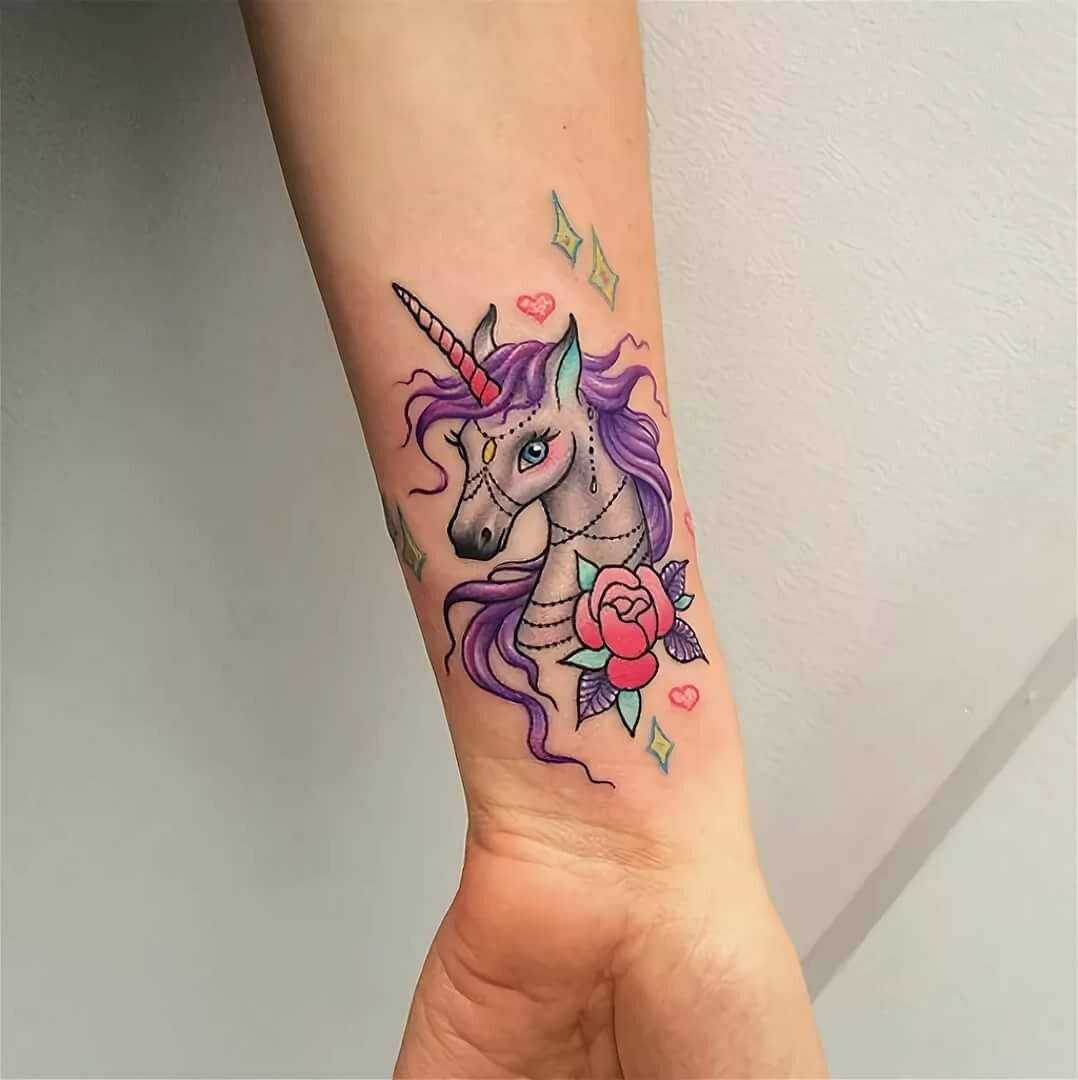 Существует много различных вариантов тату в виде единорога. Это могут быть как реалистичные изображения со сказочным персонажем, так и мультяшные веселые рисунки.