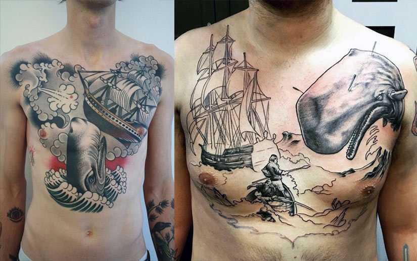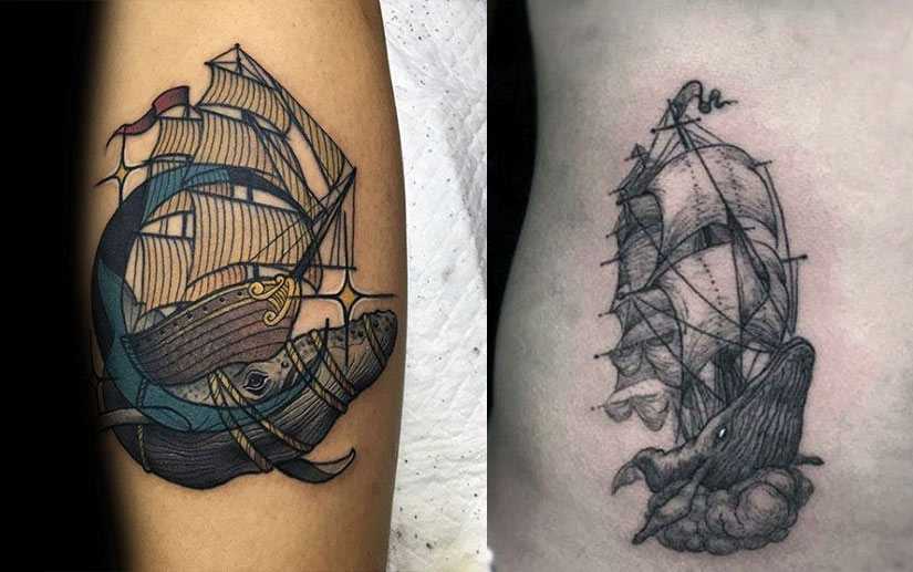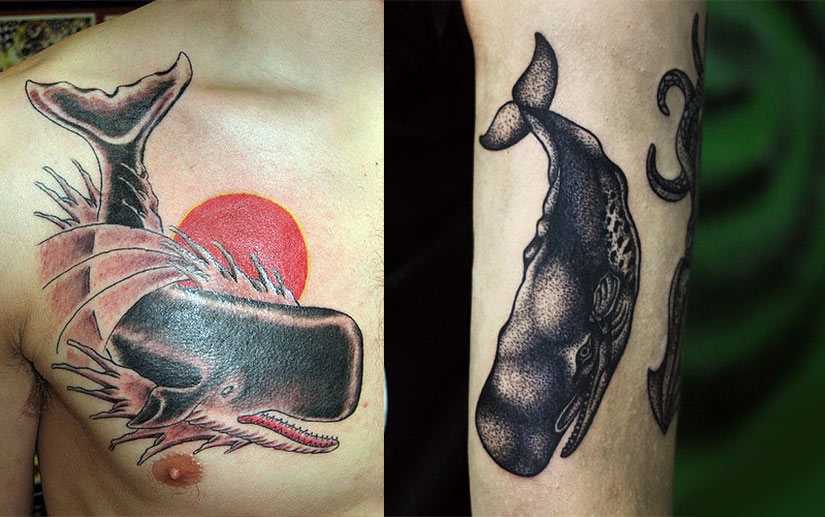 Страх перед великанами из глубин не разделяли китобои. Они осознавали опасность, но показывали своё бесстрашие. Сейчас таких людей считают жестокими убийцами, вредящими природе, а в старину их называли храбрецами. Для мужчины такая татуировка олицетворяет силу и отвагу, стойкость к любым испытаниям.