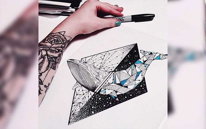 Геометрические рисунки, выполненные в технике лайнворк или графики, будут выглядеть компактными. Эти эскизы содержат минимум деталей. Довольно интересно смотрятся образы в стиле оригами с азиатскими мотивами. Вы можете создавать оригинальные комбинации на основе различных геометрических фигур.