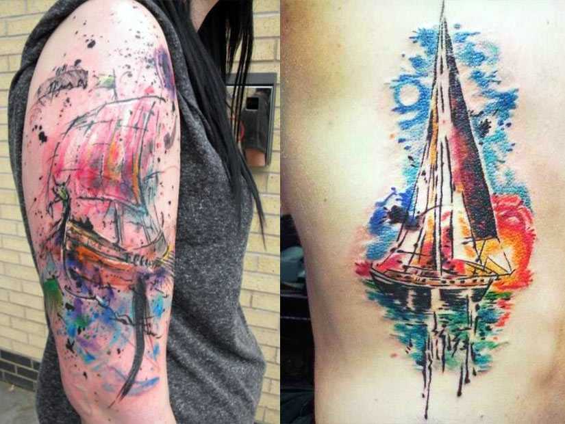 Используя стиль акварель, тату корабля можно сделать ярче и необычнее. Это направление является более молодым, но активно развивается, собирая обширную фан-базу.