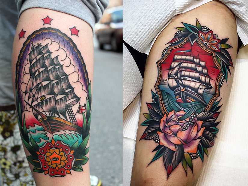 Современные и старинные татуировки кораблей создавались в самых разных стилях. Одним из наиболее популярных является Old School. Сегодня заказать олд скул тату корабль можно практически в любом . Это направление, процветавшее в Европе, а затем перекочевавшее в Новый Свет, сегодня распространено и в России. Многие мастера создают великолепные работы, не уступающие по стилю и качеству лучшим примерам из прошлого. Сложно найти более моряцкий стиль, ведь считается, что именно они привезли его на Запад.