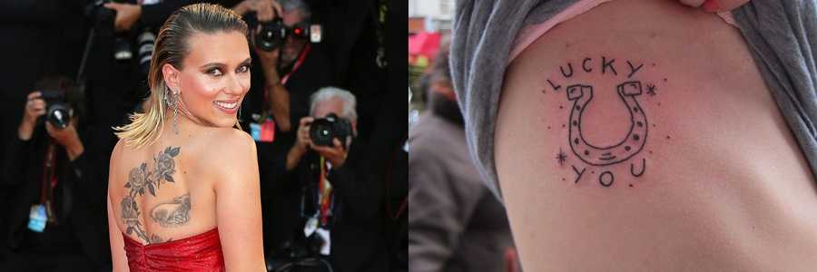 Самая масштабная наколка – роза с шипами и лежащий ягненок – занимает среднюю часть спины Черной вдовы. Скорее всего, ее можно ассоциировать с дочерью знаменитости Роуз. Изображение подковы и фраза Lucky You разместились на правом боку. Их смысл прост: Скарлетт считает себя счастливчиком по жизни. Не так давно у звезды появилась еще одна тату, связанная со съемками в «Мстителях».