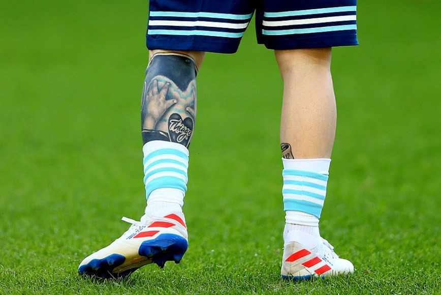 - тату Месси на ноге изначально представляло имя сына Тьяго и изображение его ручек. Позже вокруг имени появилось сердце с крыльями как знак безграничной отцовской любви;