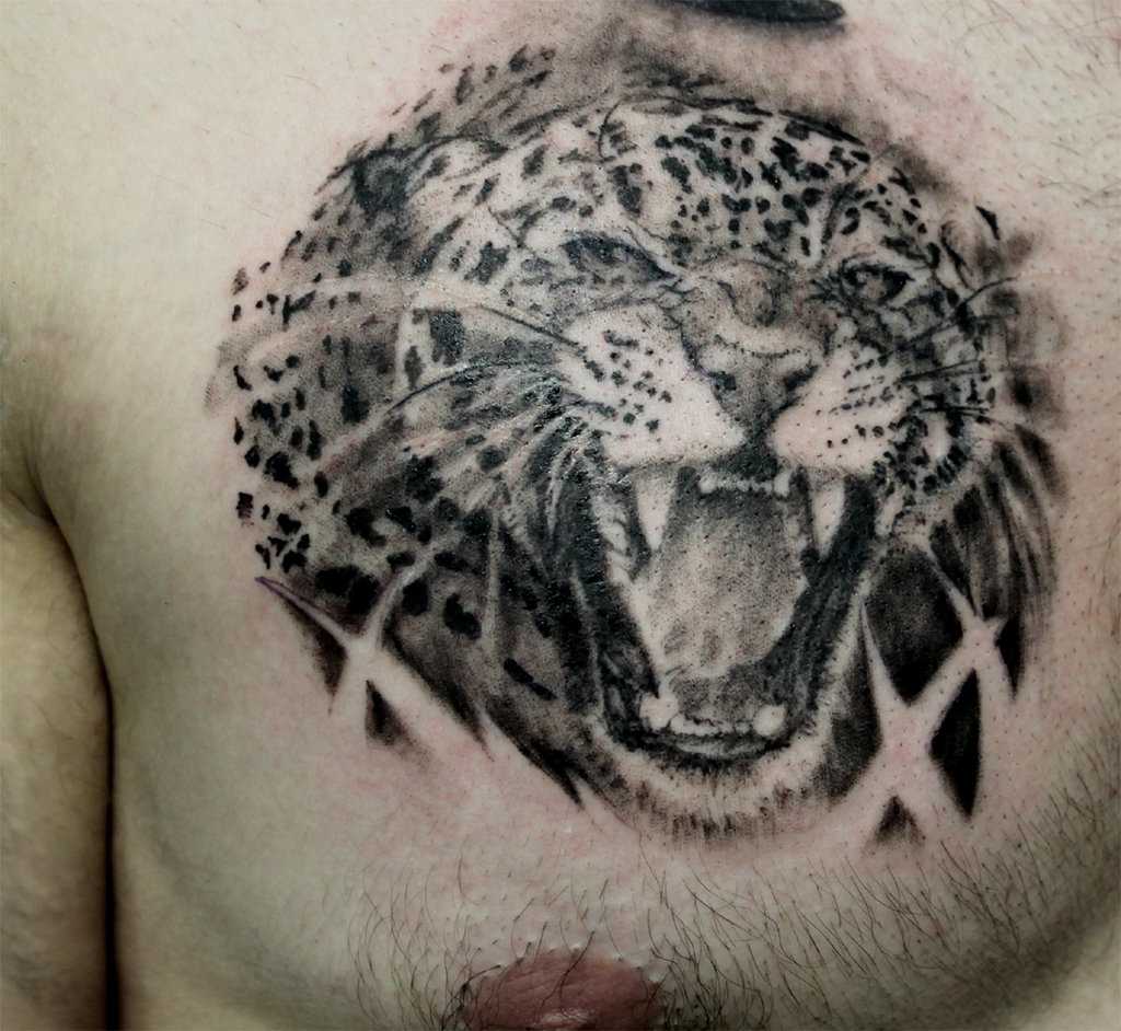 Татуировка леопард является довольно популярной как среди мужчин, так и среди женщин. Этот символ выбирают за его изящество и силу. Эскиз татуировки леопард одинаково хорошо смотрится как в цвете, так и в черно-белом варианте. Наносят изображение, как правило, на грудь, плечо, бедро, спину, а так же другие части тела.