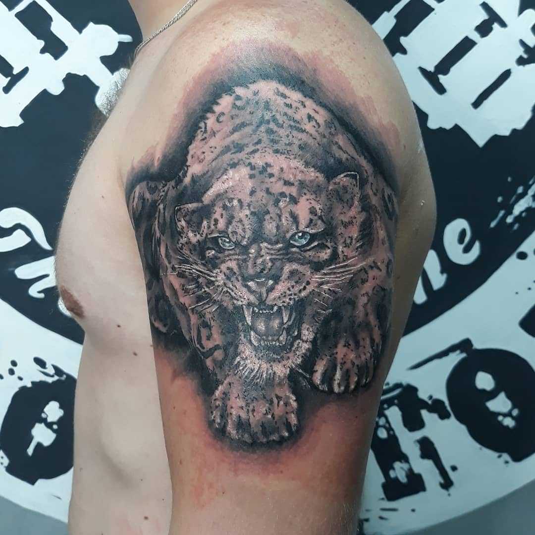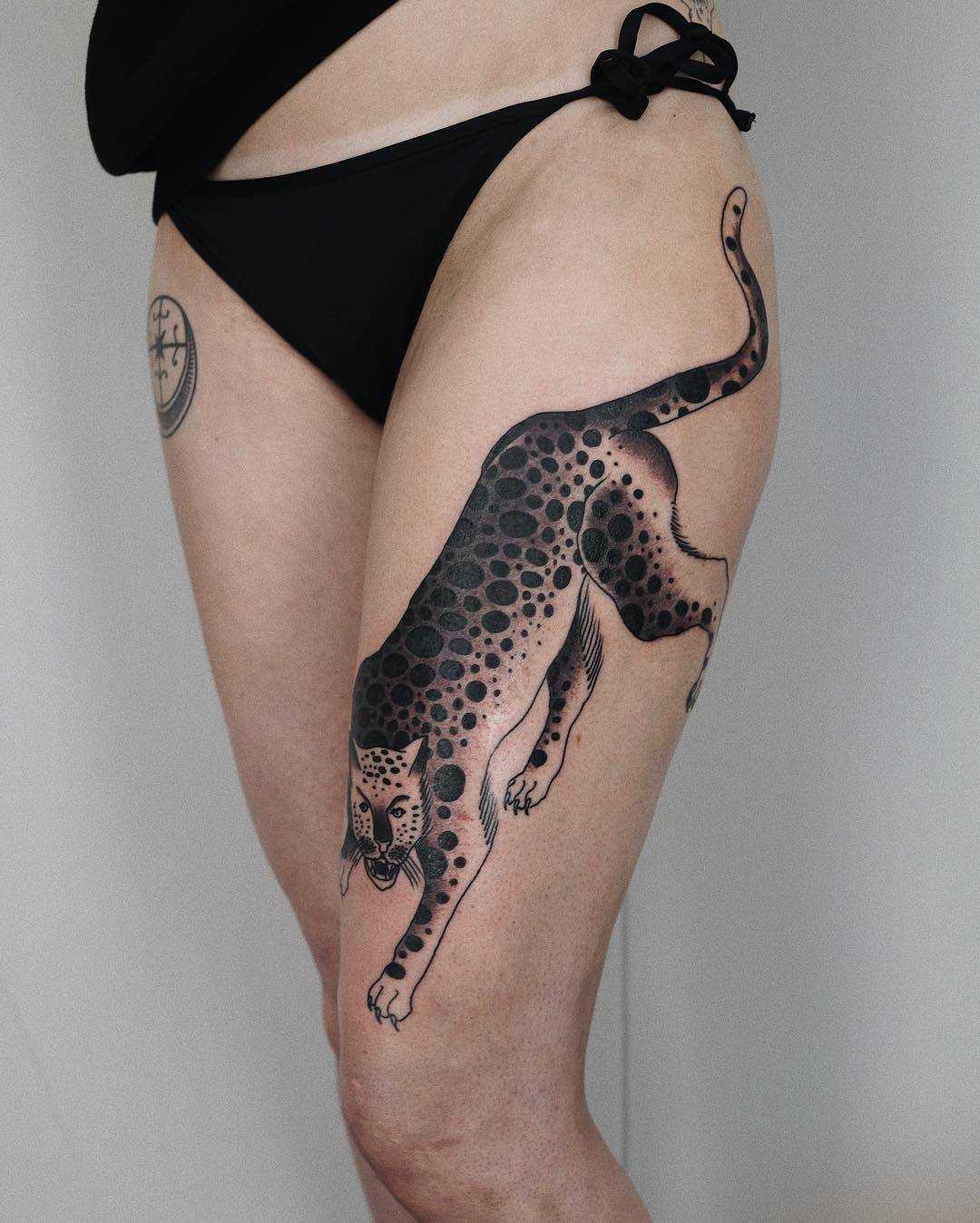 Черный леопард считается еще более агрессивным знаком. И он имеет место быть в культуре татуировки. Однако пятнистая кошка на теле смотрится намного красивее.