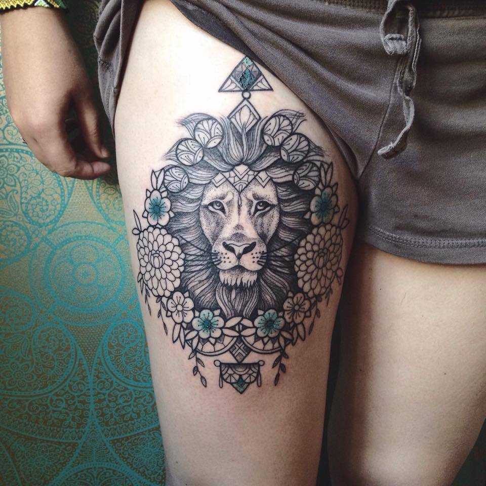 Рисунок (геометрия 50%) на бедре — тату женский лев