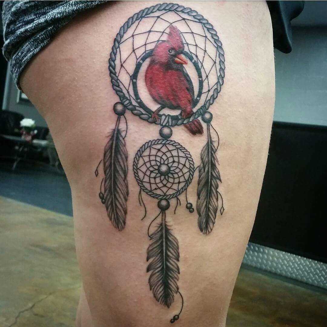 Идеально смотрится талисман, нарисованный на плече черным цветом. Но для эффектности девушки выбирают красочные изображения. В гамме присутствует зеленый, синий, оранжевый, красный, малиновый. Алый ловец снов выглядит превосходно на любой части тела.
