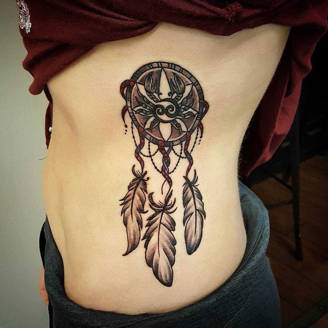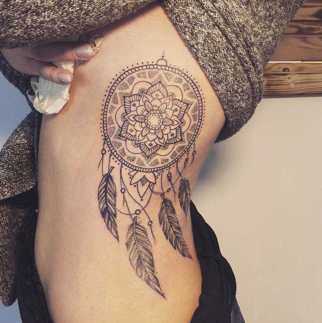 На втором месте популярных мест нанесения тату — ребра. Тут дизайн уже менее объемный, но очень интересный. Если проявить фантазию, то получиться весьма оригинальная и необычная идея для тату. Можно отметить Ловец снов в образе подковы вместо деревянного обода. Это позволит не только защитить обладательницу от дурного влияния и негатива, но и будет притягивать удачу.
