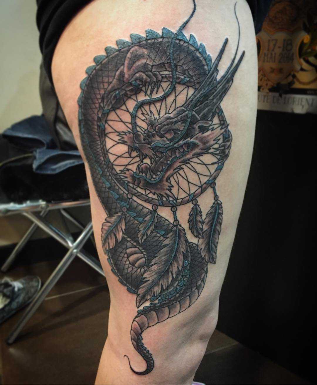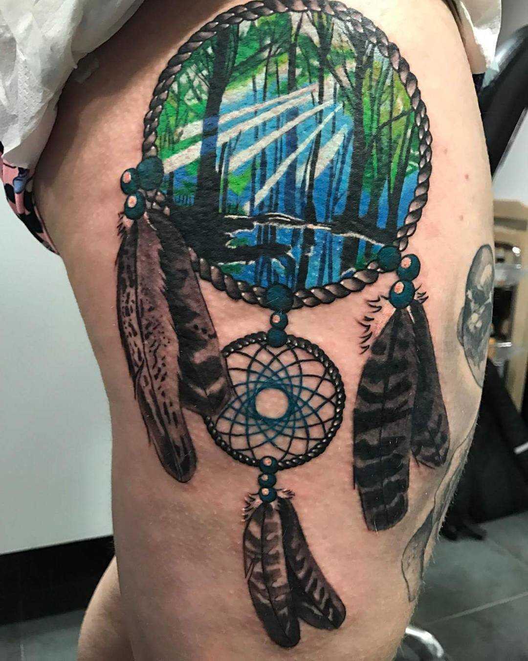 Как реализовать ловец снов на ноге? Начнём с того, что нога, это сразу несколько зон, имеющих разную площадь, форму и, так сказать, рельеф. Так на бедре поверхность ровнее, а площадь, на которой можно что-либо вытатуировать, намного больше, чем, к примеру, на щиколотке, или икре.