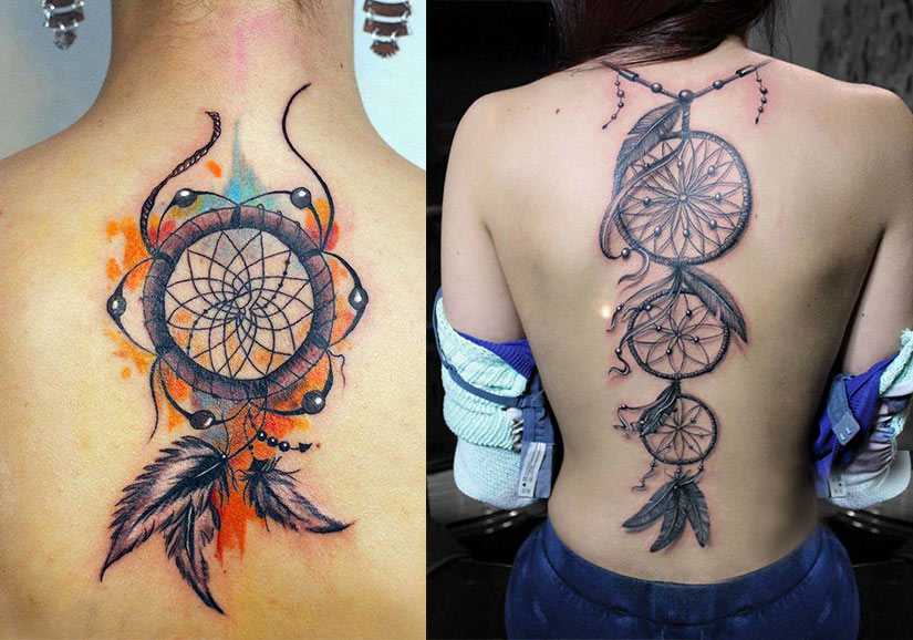 Место нанесения татуировки не имеет строгого ограничения, учитывая наши исследования, девушки в основном выбирают спину. На столь широкой площади для творческого процесса, тату с изображением Ловца снов на прекрасной женской спине получаются довольно большими.
