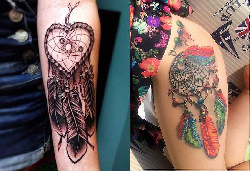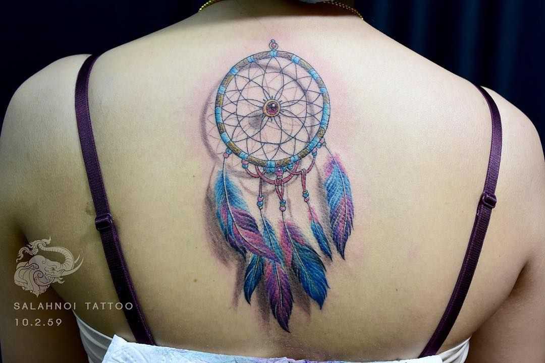 Место нанесения татуировки не имеет строгого ограничения, учитывая наши исследования, девушки в основном выбирают спину. На столь широкой площади для творческого процесса, тату с изображением Ловца снов на прекрасной женской спине получаются довольно большими.