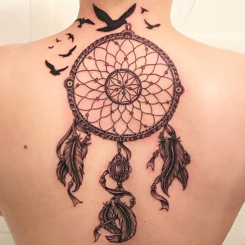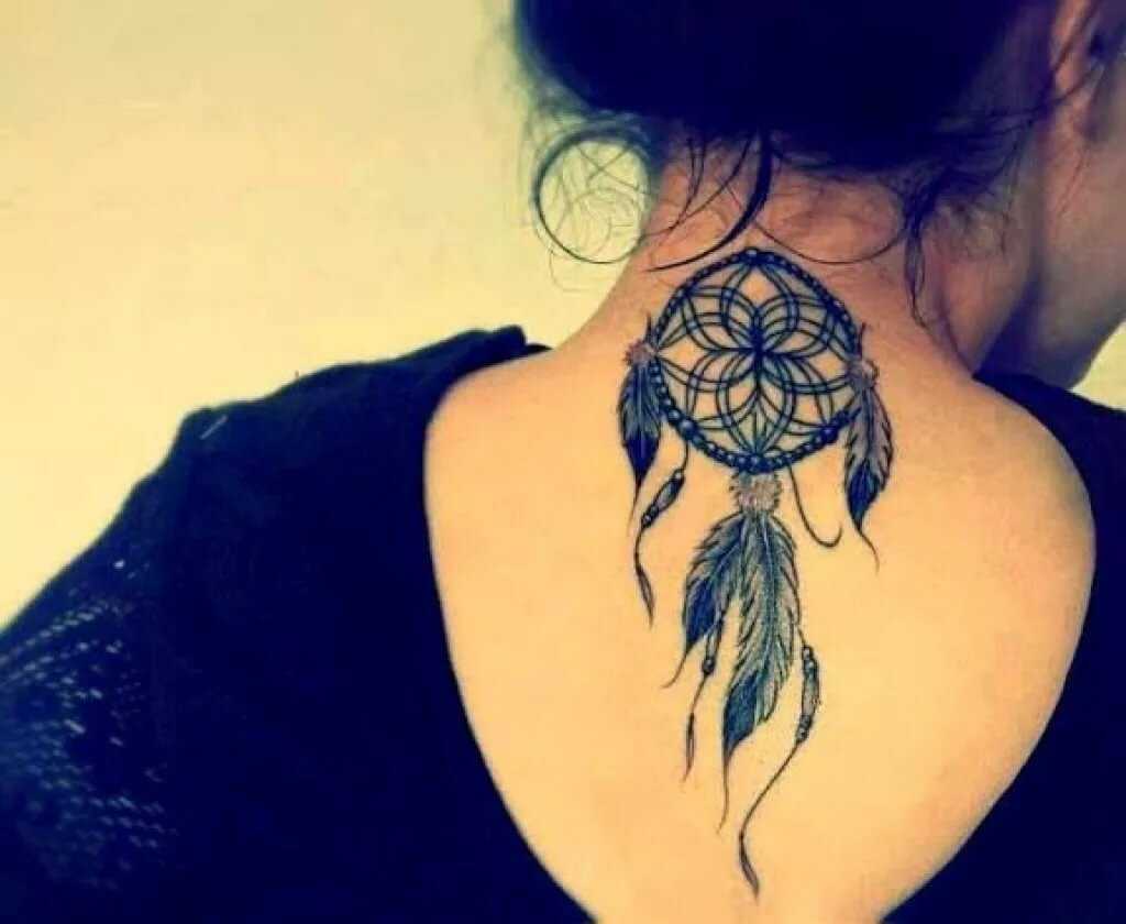 Ловец снов набитый на спине либо лопатке символизирует желание свободы выбора. Барышня находится в поисках своего жизненного пути, а амулет помогает не заплутать и ведет к светлому будущему.