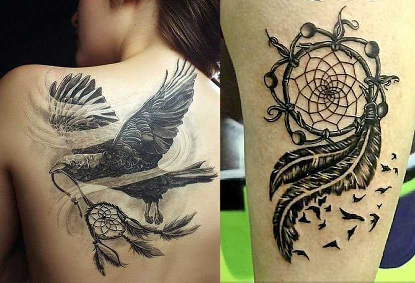 - С перьями мифических и хищных птиц. Несмотря на то, что изображение ловца снов с перьями является классическим, можно увидеть немало различных видов тату с перьями павлина, или же орла. Таким тандемом подчеркивается не только защита, но и свобода хозяина татуировки.