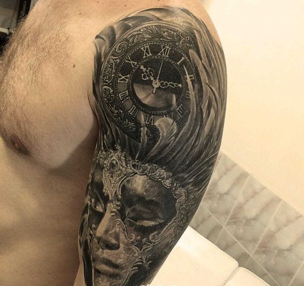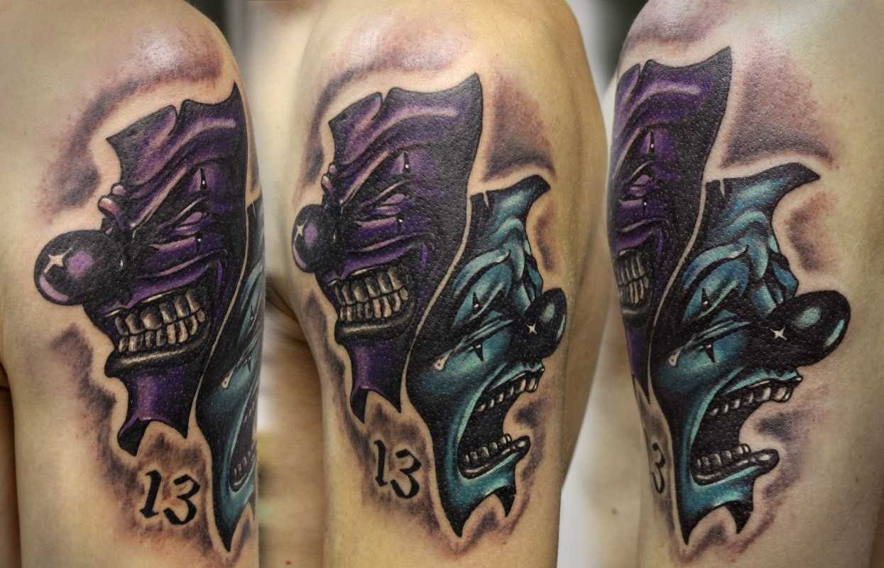 Татуировка с двумя масками смотрится очень выигрышно. Она может быть, как цветной, так и черно-белой. Рисунок имеет глубокое философское значение: иногда хорошие намерения приносят страдания, а плохие поступки — радость. Контрастность двух ликов смотрится эффектно. Например, смеющийся дьявол и грустный ангел, расположенные на рукавах. Такая тату говорит о владельце, как о творческой личности, не лишенной доли лицемерия.