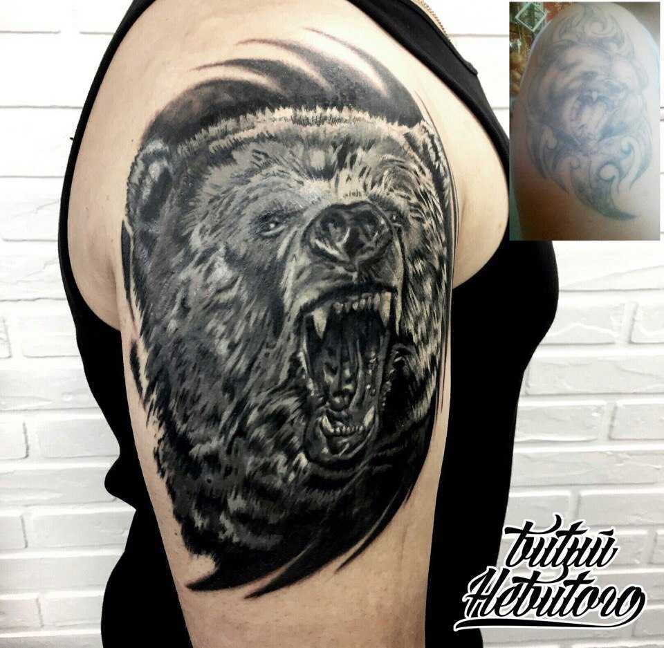 Некоторые личности наносят голову робота-хищника: с одной стороны густая шерсть, с другой металлические элементы. Для нательных рисунков лучше выбирать крупные эскизы и даже целые текстуры. Интересно смотрится медведь в доспехах с мечом и щитом и сосредоточенным взглядом. Часто встречаются татуировки медведя на ноге и руке: на переднем плане его голова и две большие лапы с когтями. Дополнительными элементами могут быть тайга, доспехи, царапины, капли крови.