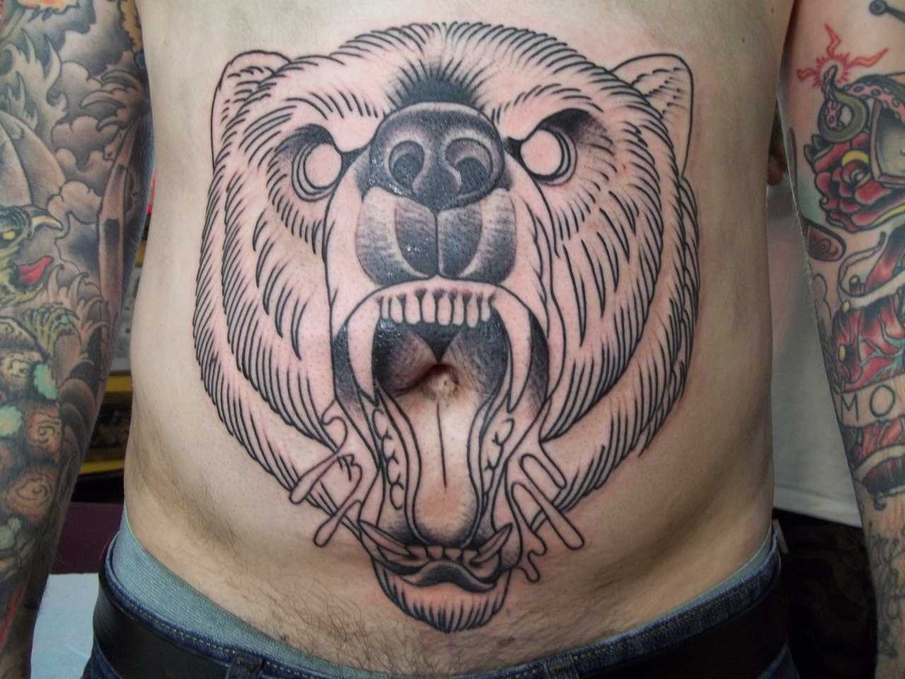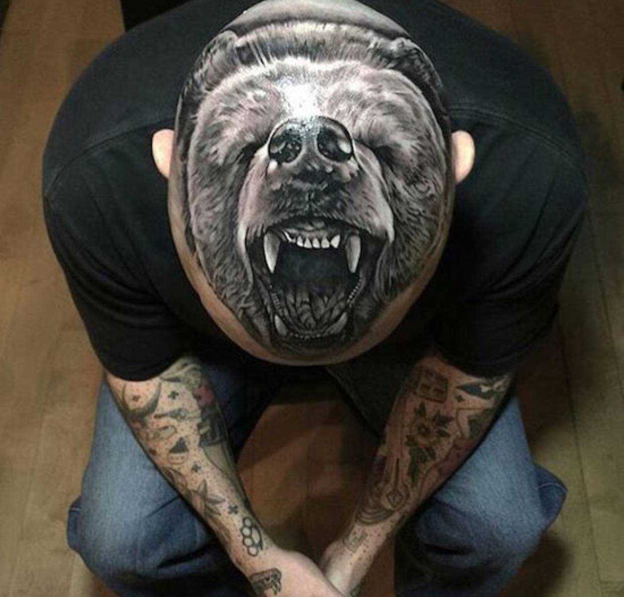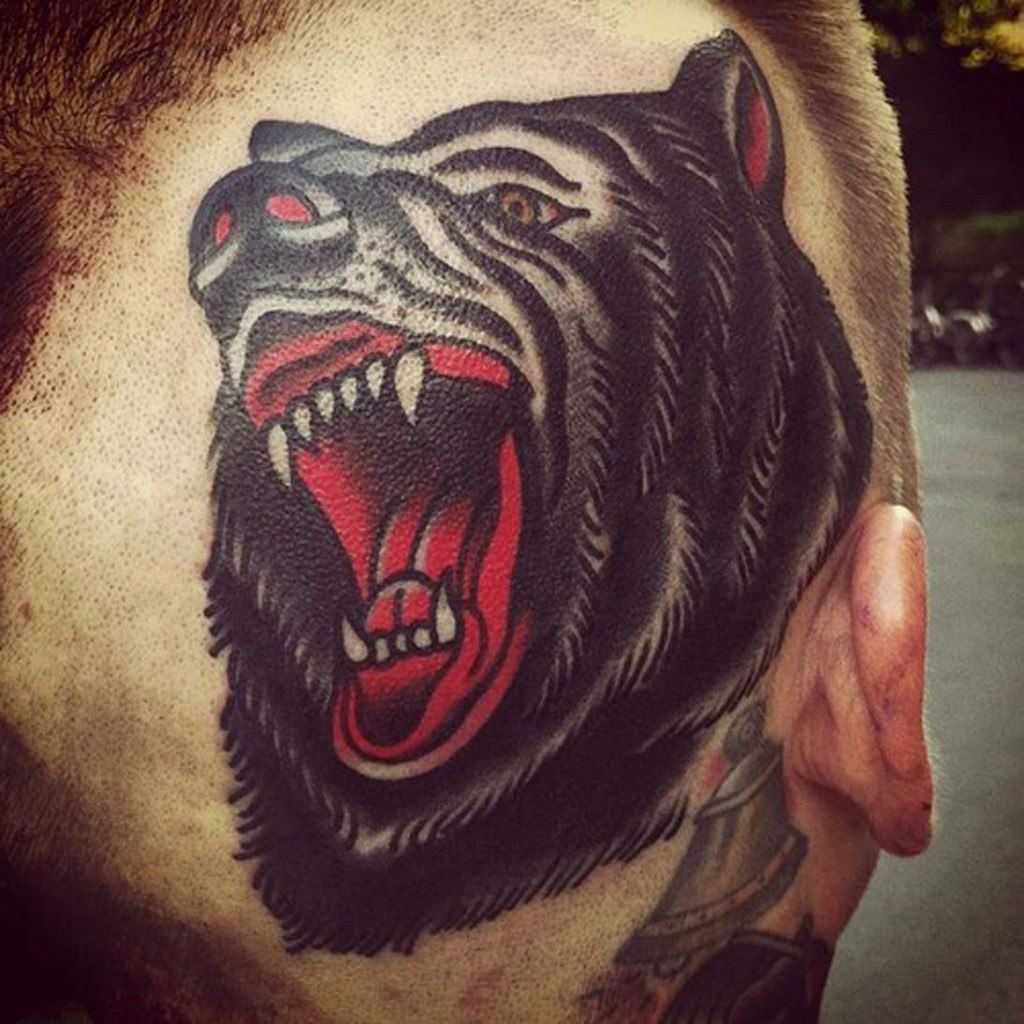 Этот дизайн источает огромную силу и свирепость величественного зверя. Обычно голова медведя с оскалом размещается на более широких и больших участках: на грудине, на плече или на спине. Иногда рисунок может выполняться в 3D для придания реалистичности и красоты.