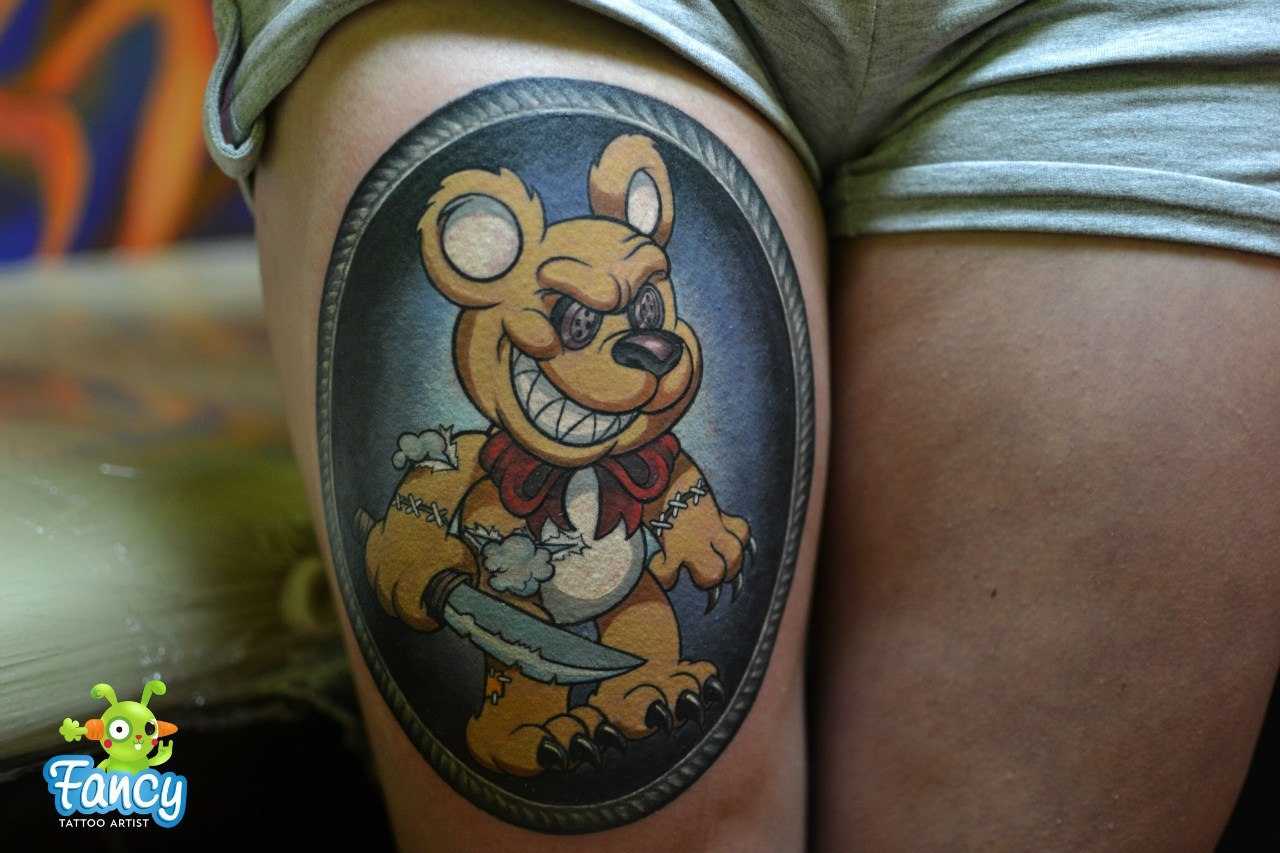 Милый и плюшевый мишка – любимая игрушка каждого ребенка. По этой причине, тату игрушечного мишки могут набить на свое тело те люди, которые хотят создать игривый образ. Такое изображение будет нести добрые помыслы: кокетливость, милость, душевность, дружелюбие.