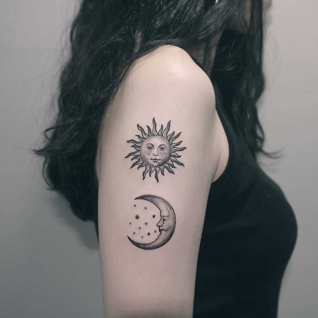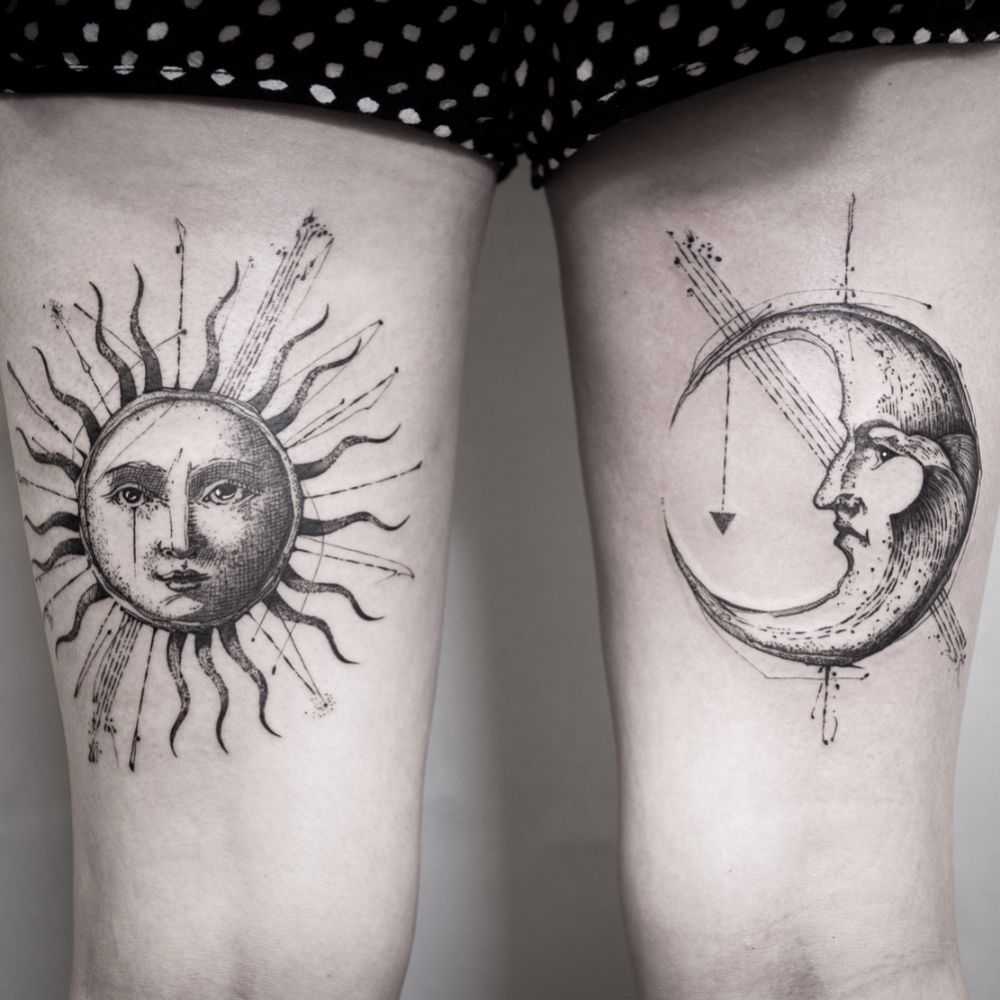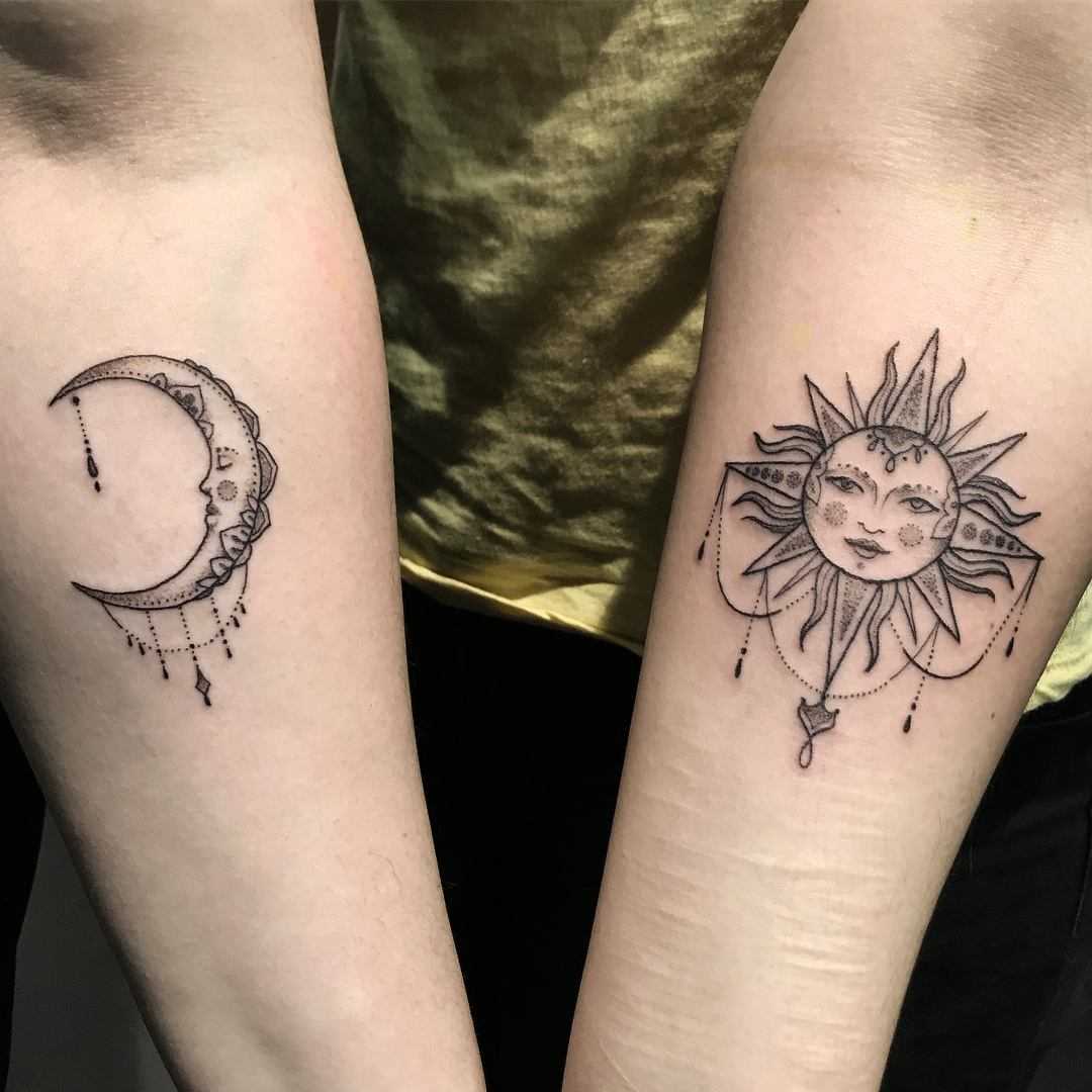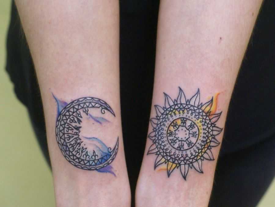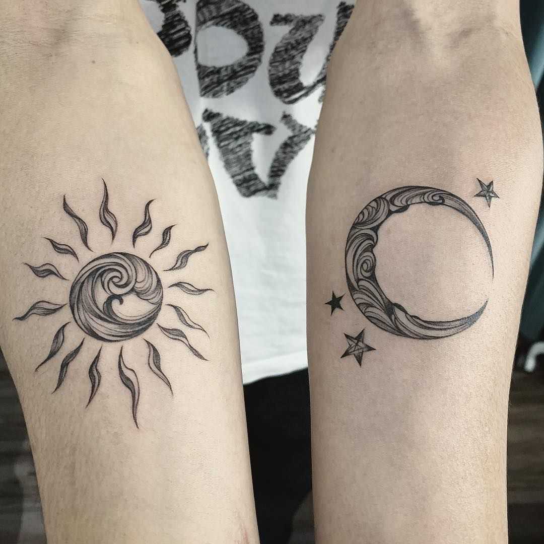 Это может быть как рисунок одного месяца или изображение сразу двух небесных светил – месяца и солнца. Интересным будет вариант нанесения таких тату на двух руках.