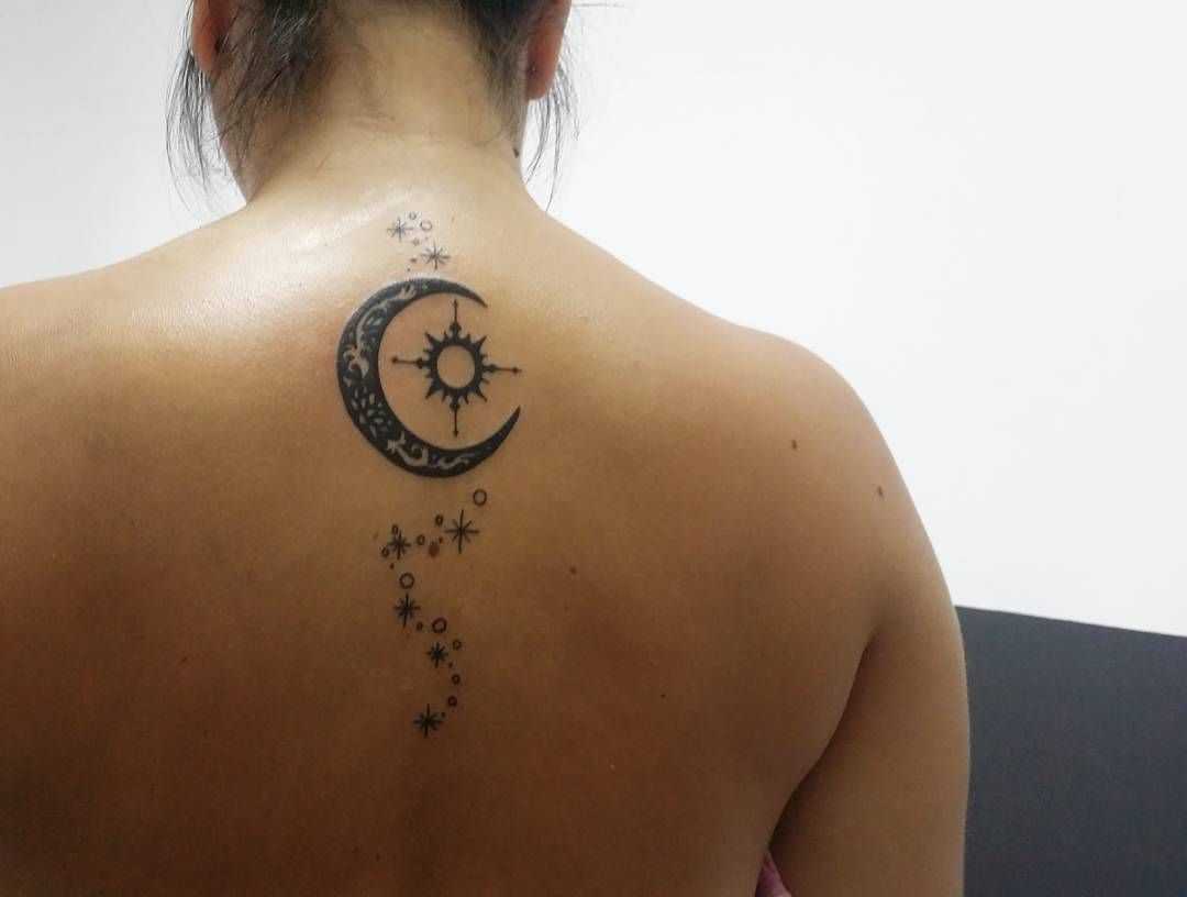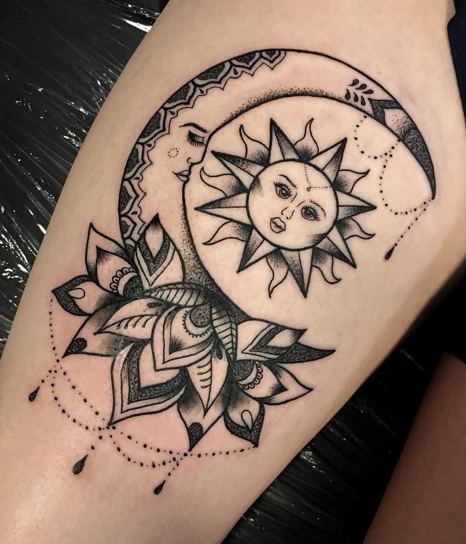 Тату в виде полумесяца отлично сочетается с символом Солнца: получается своеобразный аналог восточной концепции «инь-ян». Этот вариант также считается символом гармонии (в одном из толкований – равноправия во всем), спокойствия, равновесия.