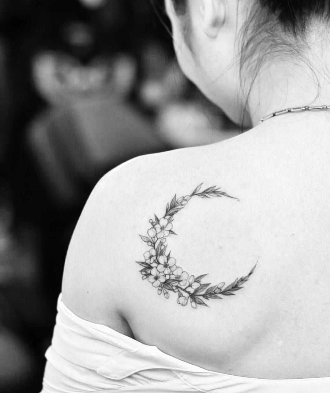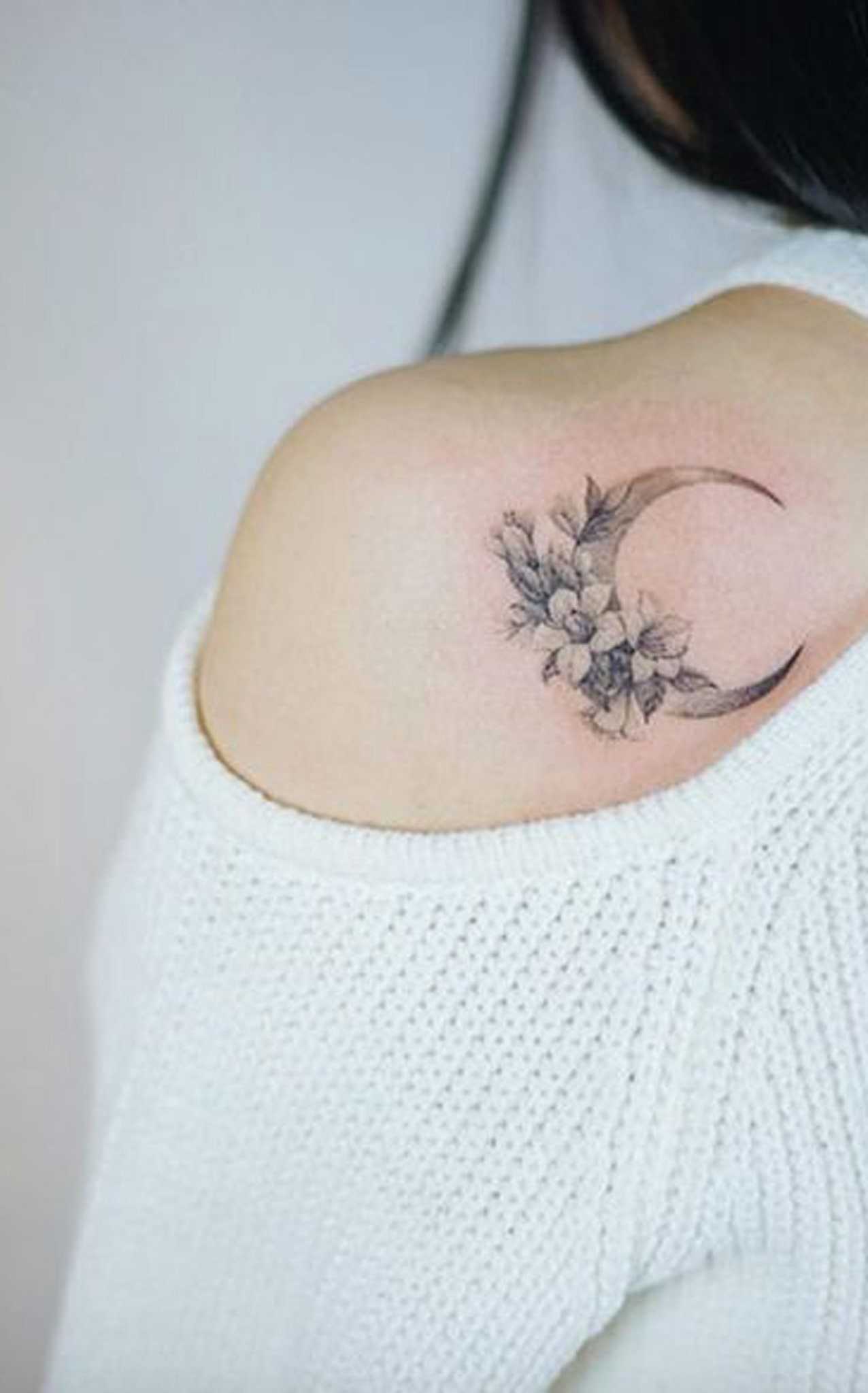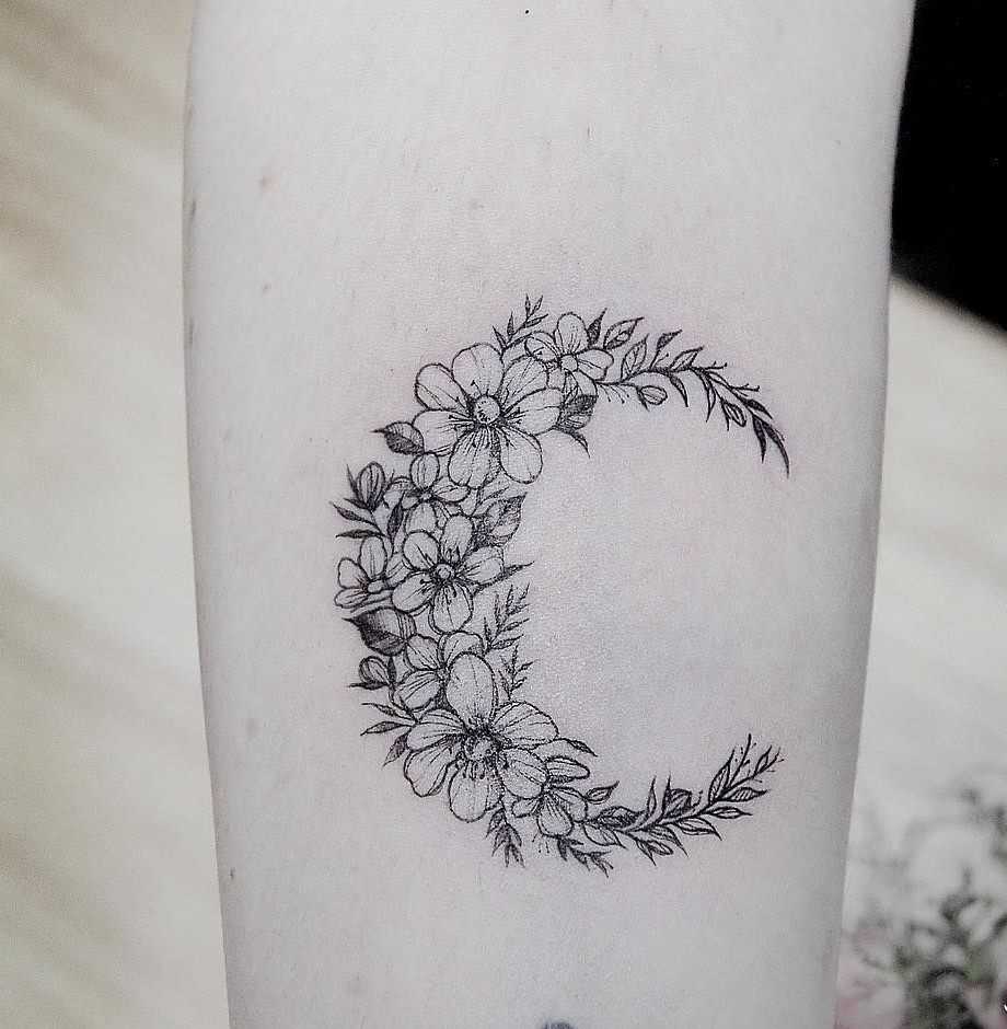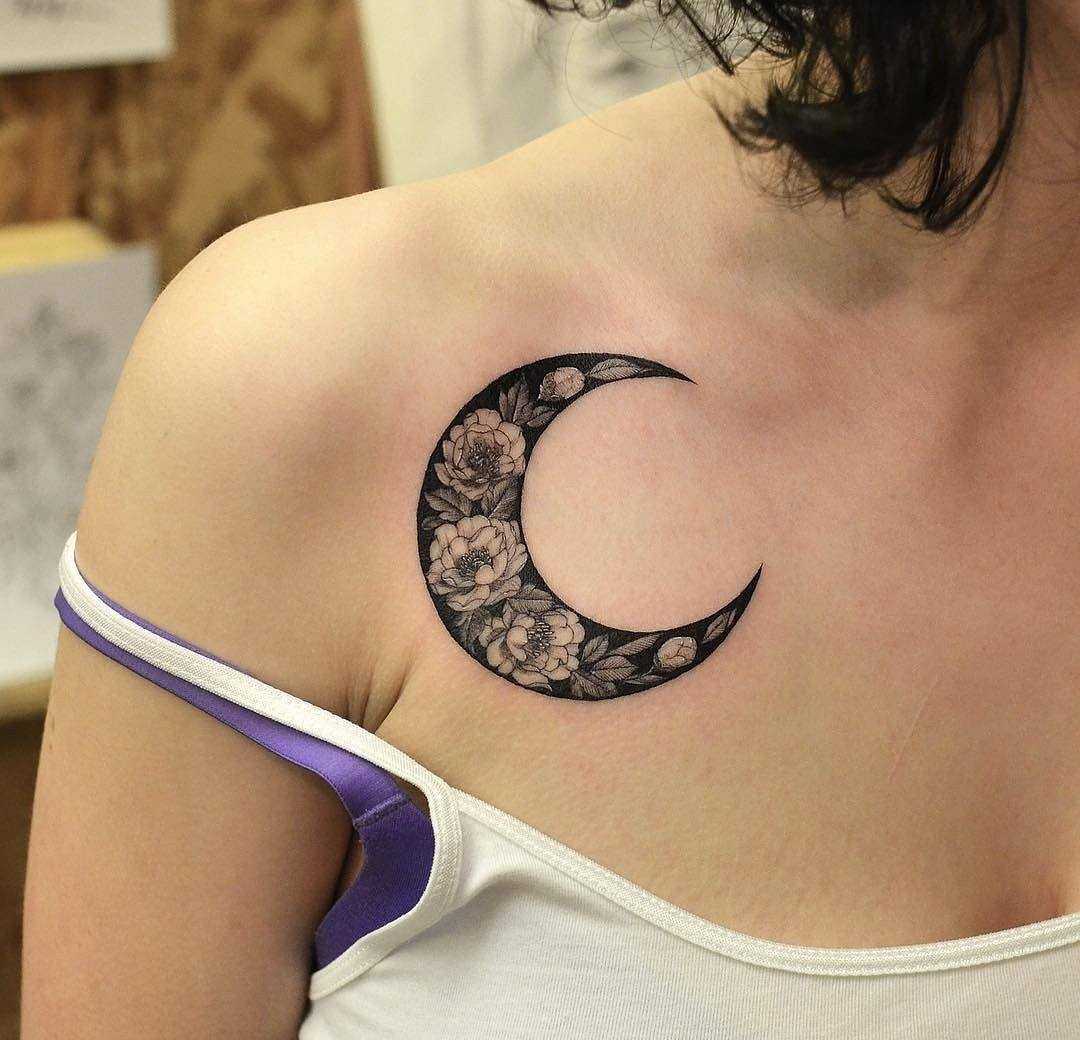 Образом месяца в цветочном ореоле украшают кожу девушки. Повернутый в правую сторону он обозначает расцвет молодости и внутренней энергии. Дополненное стрекозами или бабочками тату обращается к раскрытому сознанию и гибкости в принятии решений.