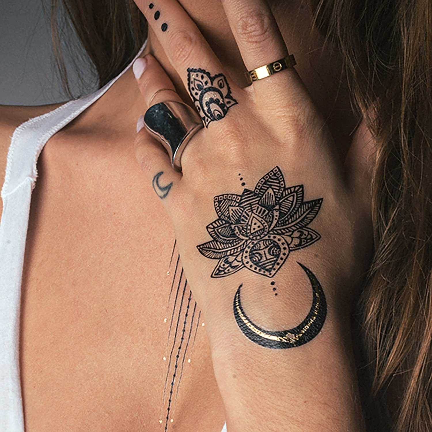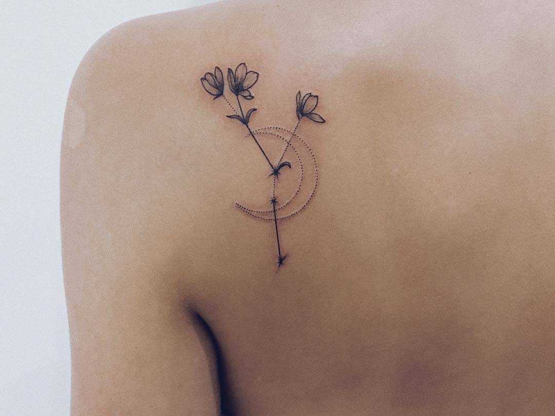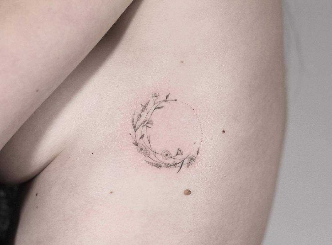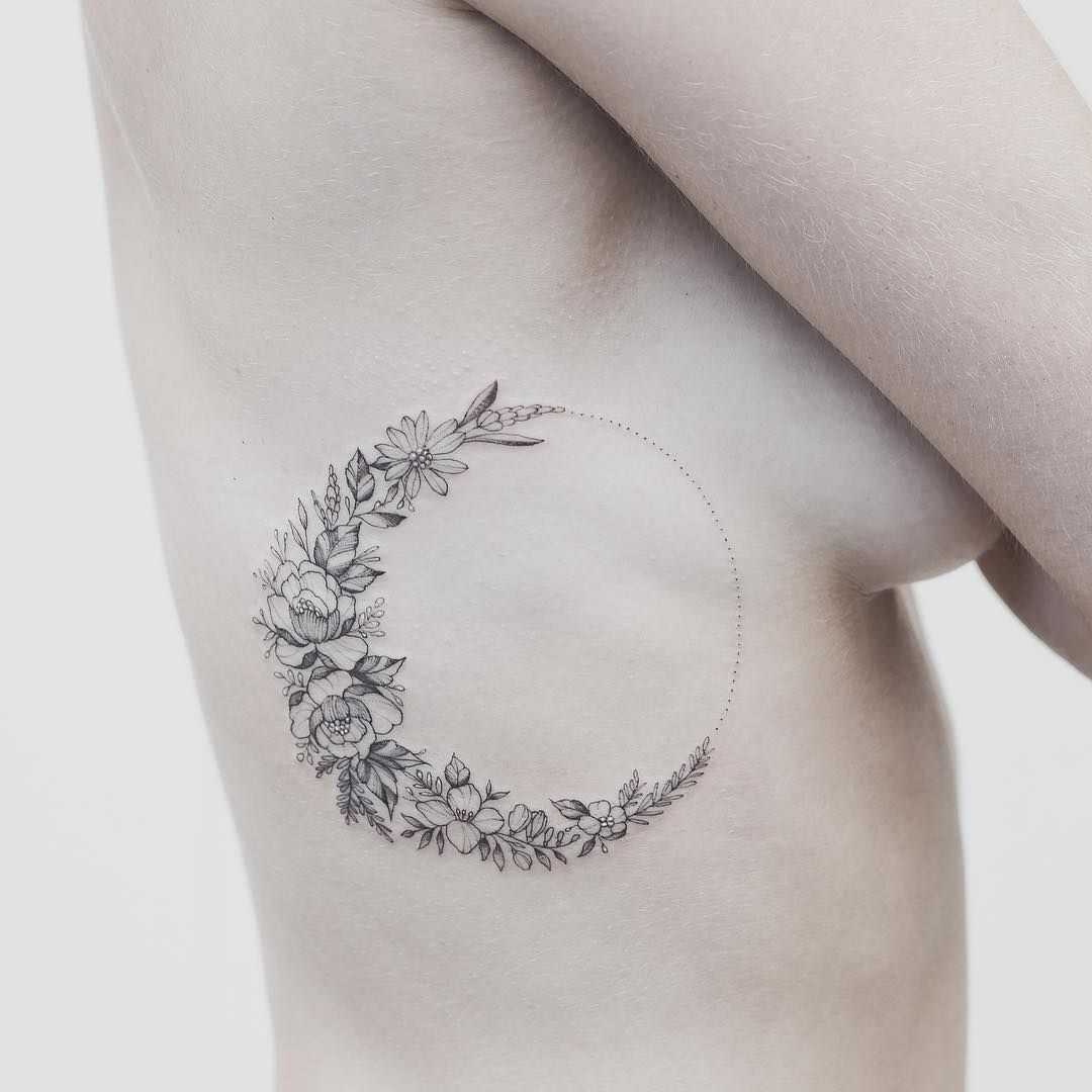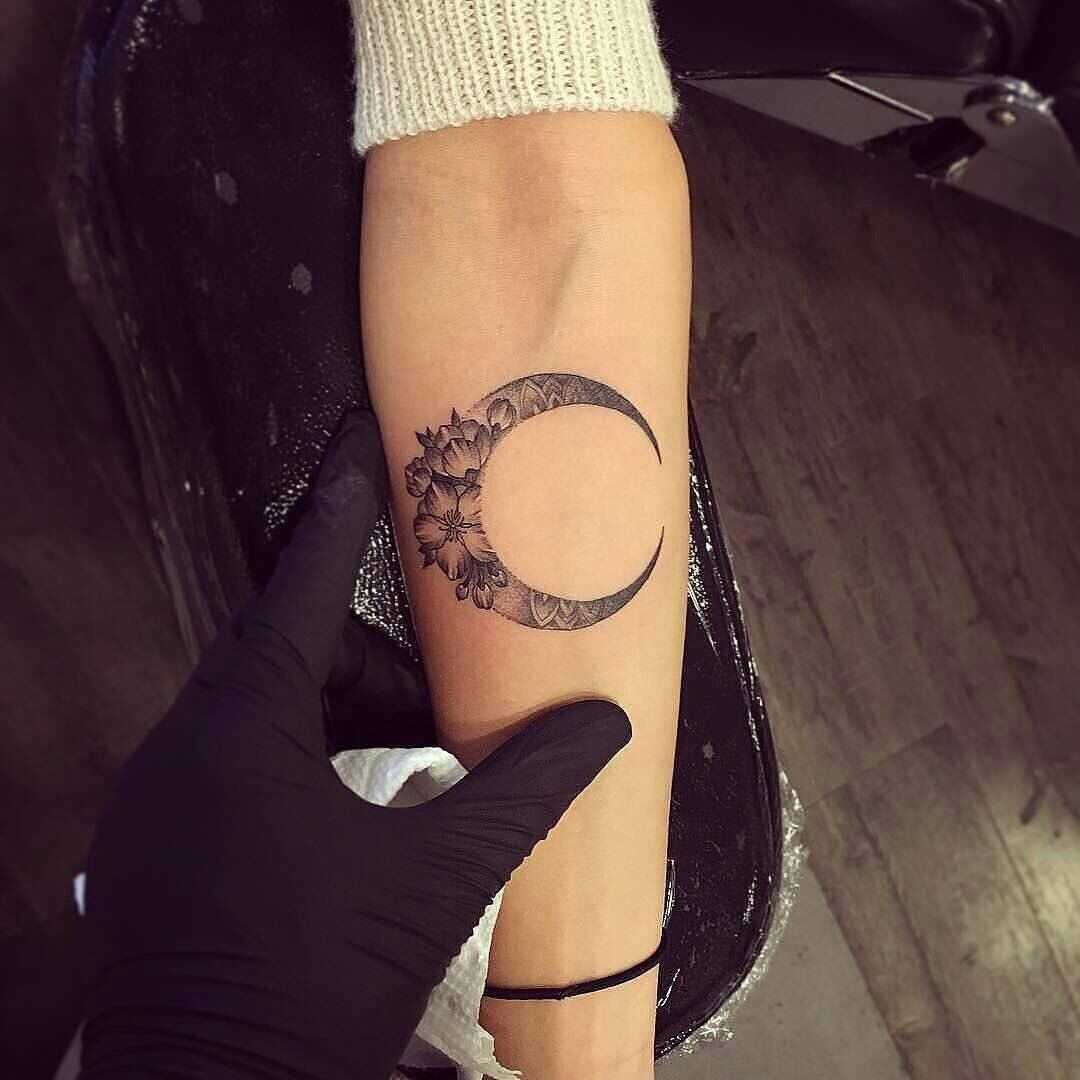 Образом месяца в цветочном ореоле украшают кожу девушки. Повернутый в правую сторону он обозначает расцвет молодости и внутренней энергии. Дополненное стрекозами или бабочками тату обращается к раскрытому сознанию и гибкости в принятии решений.