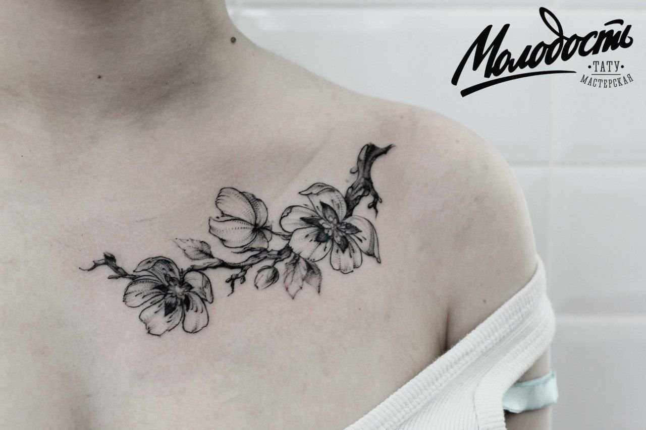 Практически у любой девушки имеется желание сделать тату на ключицах именно в виде цветов, поэтому их изображение на теле является некой традицией. Особо почитаемым местом были и есть ключицы, которые подчеркивают изящество и стройность тела.