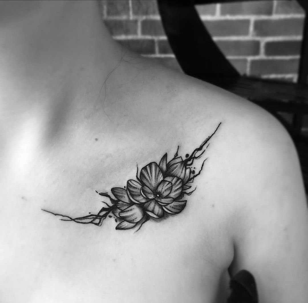 Женственность и романтичность подчёркивают татуировки цветов. Очень элегантно на ключице выглядят бутоны, дополненные узорами или плетением из стеблей и листьев растения. Такие рисунки смотрятся лаконично как на одной ключице, так и на обеих.