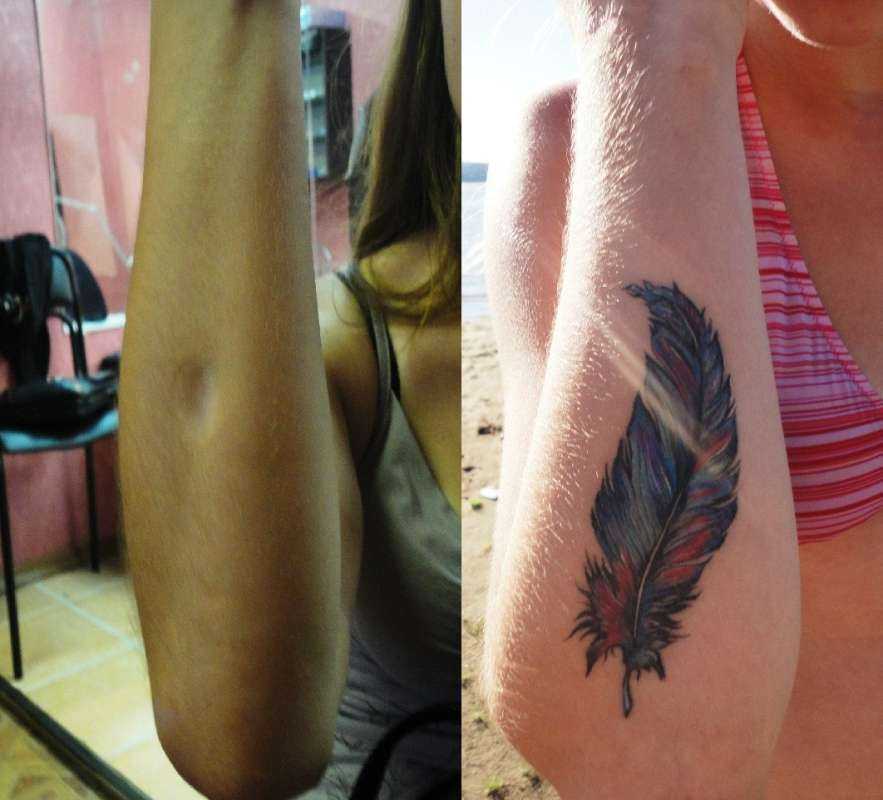 Опытному специалисту бить тату на шрамах несложно. Он знает, что для получения картинки хорошего качества необходимо использовать несколько цветов одновременно, а не ограничиваться одним тоном. Неровности отлично скрывают тени, блики, полутона. Рубцовая ткань может поглотить небольшое количество краски, поскольку структура кожи на прооперированном участке нарушена.