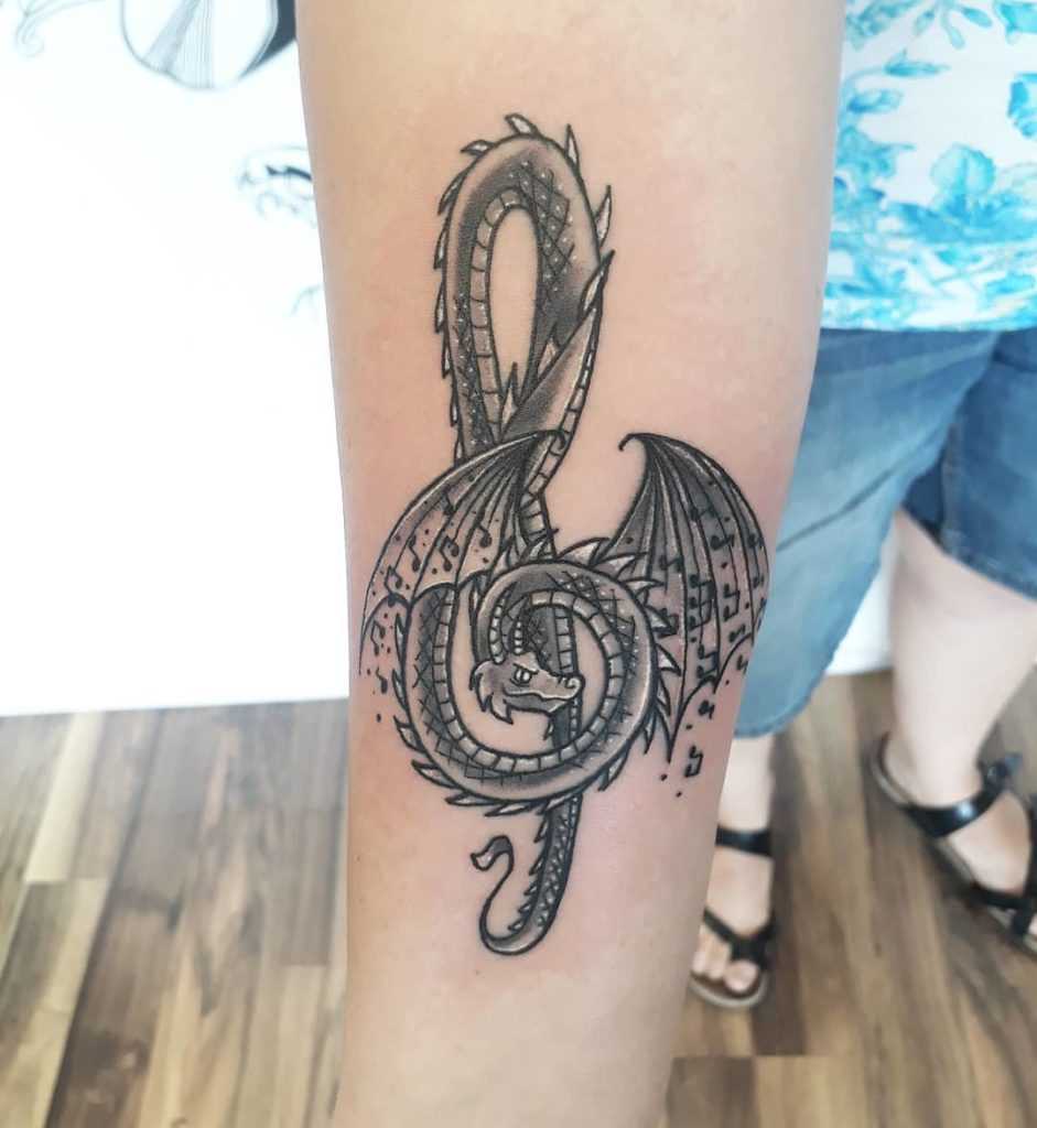 В искусство тату изображение скрипичного ключа пришло относительно не так давно, но стало популярной и востребованной не только в музыкальных кругах. Татуировка скрипичного ключа несет позитивное значение, поэтому пользуется большой популярностью. Изображение скрипичного ключа очень часто дополняют различными нотами, что выглядит музыкально, красиво и эффектно. Наносят такую татуировку на различные части тела. Мужчины предпочитают объемные тату, нанесенные в область плеча, предплечья или шеи. Девушки выбирают миниатюрную композицию скрипичного ключа и нот. Такая татуировка изящно украсит любую часть женского тела.