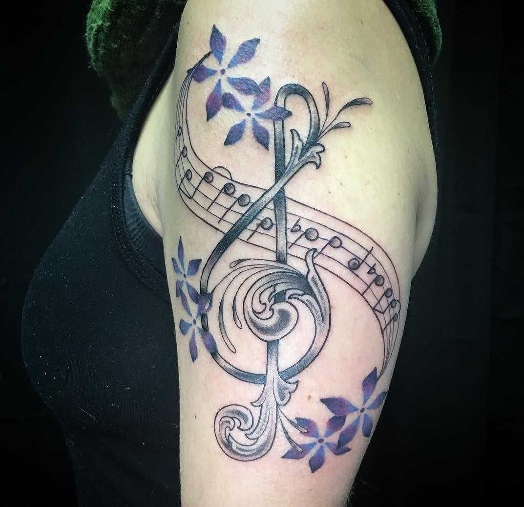 Кроме того, подобное нательное изображение может свидетельствовать о том, что его обладательница профессионально занимается музыкой или же является поклонницей отдельных музыкальных групп, исполнителей. Однако иногда представительницы прекрасного пола могут украшать свое тело красивой татуировкой из-за оригинальности рисунка. В таком случае тату нередко дополняется другими интересными элементами.