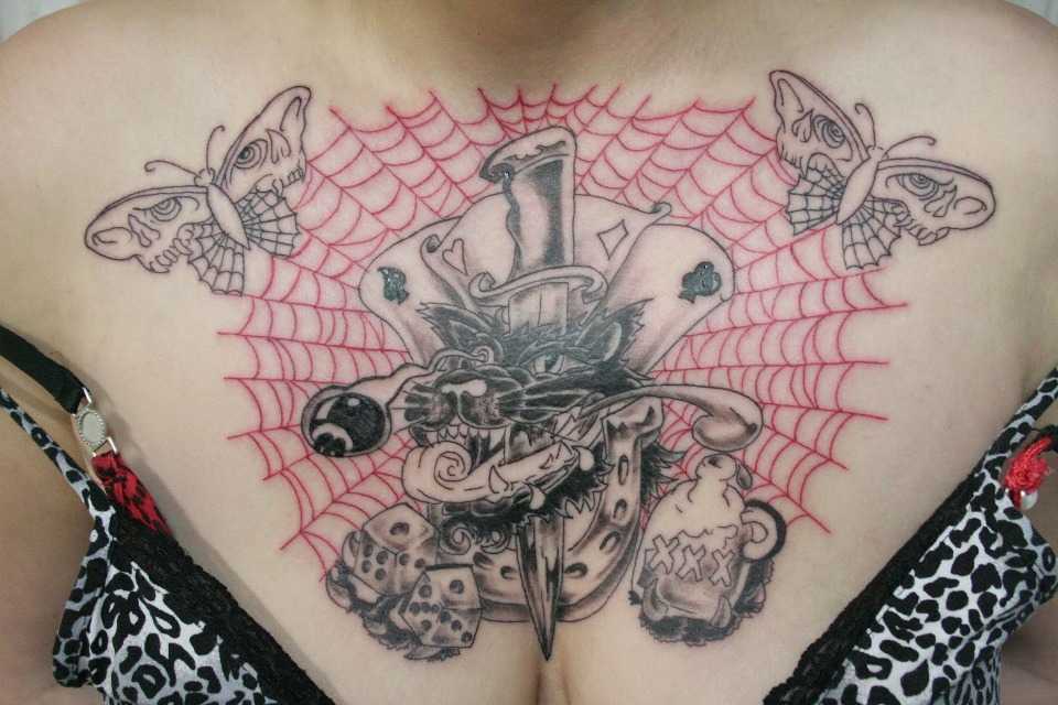 Наколка на таком месте распространена по понятным причинам в большей мере среди мужчин. Она встречаются в составе больших композиций. Тату благодаря обилию тонких линий эффектно подчёркивает рельефность мышц, придаёт объём. Тату паутина на груди часто бывает выполнена в ярком стиле. Но она и без того бросается в глаза из-за местоположения.