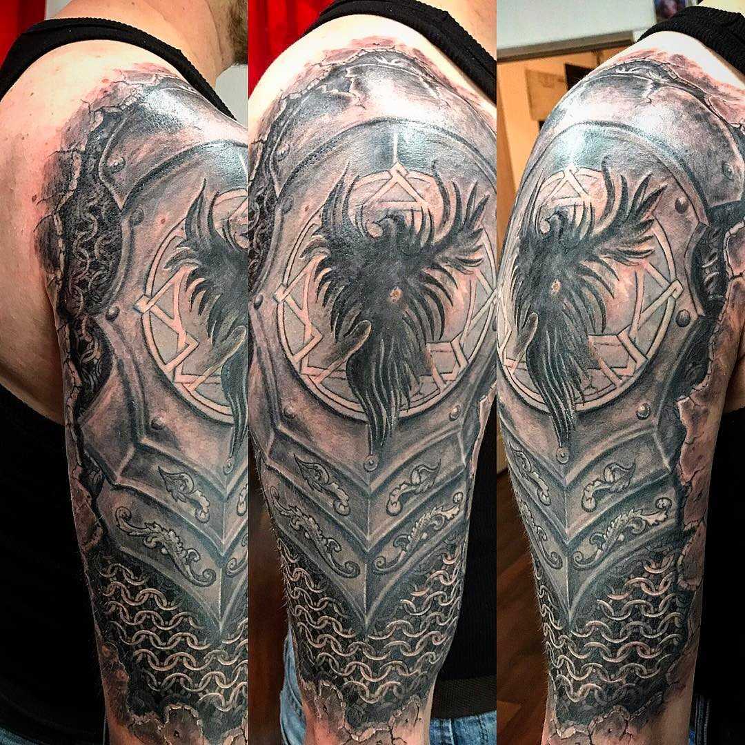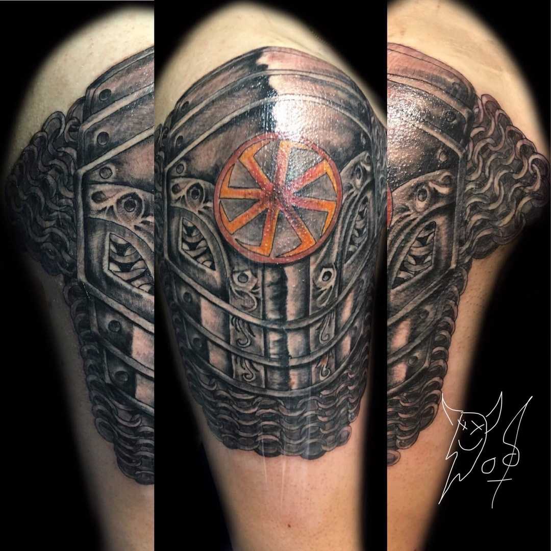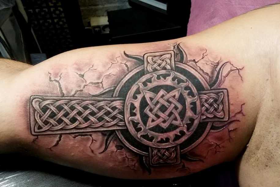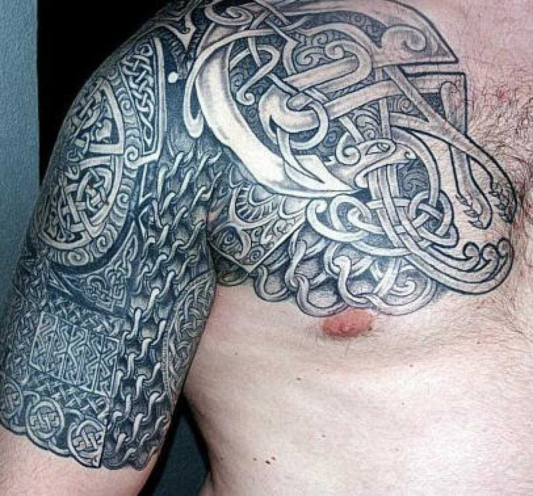 Цветовая гамма для мужских тату чаще всего тёмная, с использованием чёрного и серого цветов. Тёмные мужские татуировки на плече, фото которых вы отыщете на нашем сайте, имеют чёткие контуры и качественно прорисованные элементы, рисунок выглядит привлекательно и притягивает к себе все взгляды. Плечо прекрасно подходит для изображения чёрно-серых рисунков воинов, в шлемах и с оружием – благодаря изгибам и мускулам тату выглядит объёмно и очень реалистично. Такие старославянские татуировки для мужчин, в наши дни получившие множество вариантов и сюжетов, отличаются своим колоритом и неповторимым сочетанием древнего и современного.