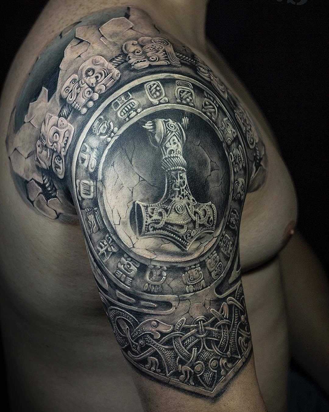 Символы славянских богов и богинь также пользуются популярностью среди мужчин, которые хотят выразить свою веру и уважение к древним божествам. Изображение Перуна, Велеса, Мокоши или других богов может стать великолепным элементом славянской татуировки на плече.