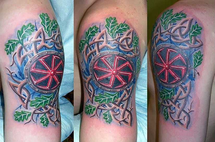- Символ дерева (обычно изображение дуба). Славяне ассоциировали это растение с защитой, плодородием и силой. На теле набивали целые пейзажи с дубом. Птиц и животных применяли для сопутствующих деталей. Наличие в тату определенного числа веток указывало на конкретное время.