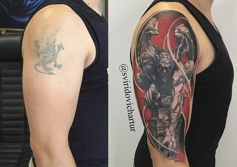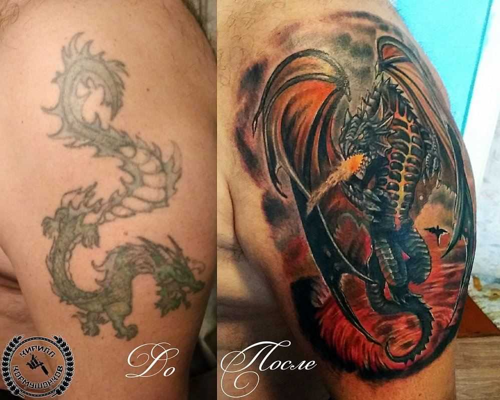 Перекрыть чёрную татуировку жёлтым просто невозможно. Тёмный цвет проступит через некоторое время некрасивой грязной кляксой. Чёрный нательный рисунок перекрывается только другим чёрным изображением. На синюю краску следует накладывать аналогичный цвет. Те же правила актуальны и для красного. Если перекрытию подлежит выцветшая или светлая татуировка, то это значительно облегчит поставленную задачу. В этом случае в работе могут быть использованы любые белее насыщенные или тёмные пигменты. Также следует понимать, что новая татуировка будет иметь большие размеры, чем предыдущий эскиз.
