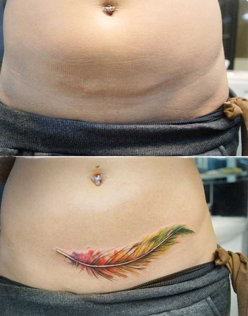 Помимо этого тату внизу живота выполняют поверх рубцов после операций или кесарево сечения.