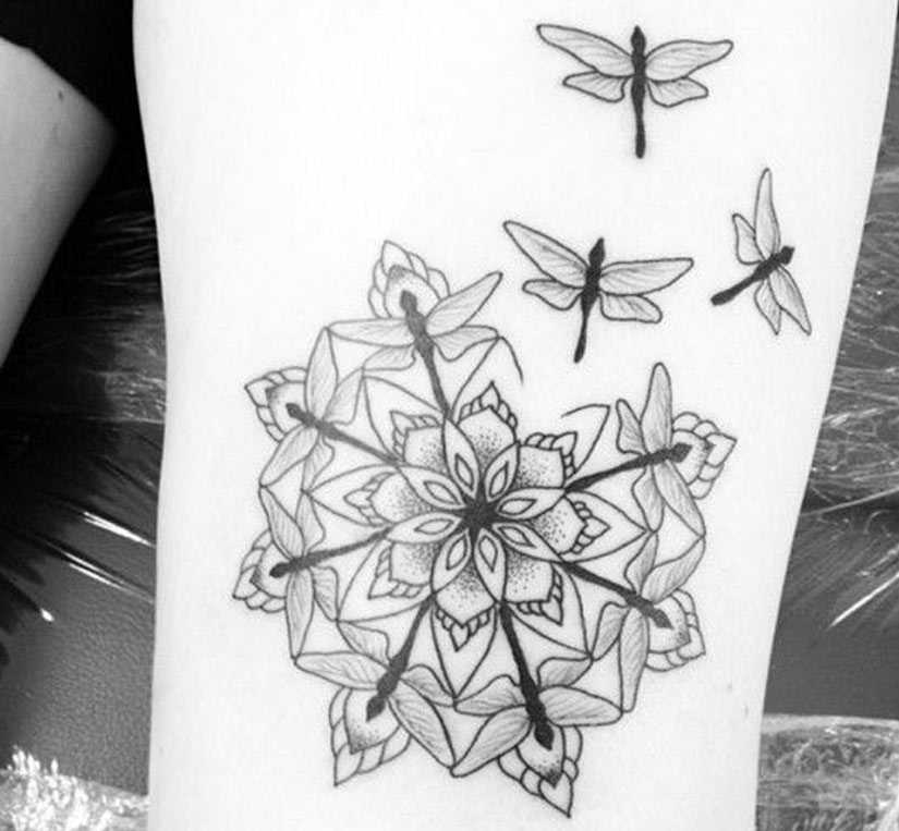 Люди, для которых свойственно стремление к духовности, часто выбирают рисунок стрекоза на лотосе. Это олицетворение космической гармонии внутри человека и вокруг него. Интересно выглядит техника mandala. Это отсылка к индуизму. Мандалы, это особые рисунки, узоры, созерцание которых позволяет добиться определенных изменений в человеческой психике, поменять настройки.