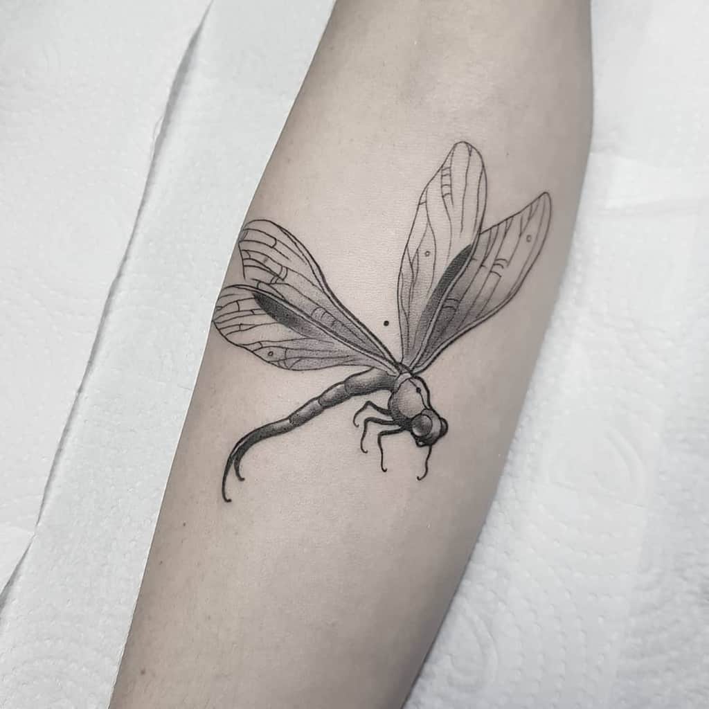 Кроме того, удаляя цвет с милой татуировки стрекозы, вы привлекаете внимание к самому телу, а не только к эффекту, который пытается создать ваш тату-мастер. Детали части тела можно подчеркнуть тонкой тушью, что означает, что больше внимания можно уделить голове и многогранным глазам