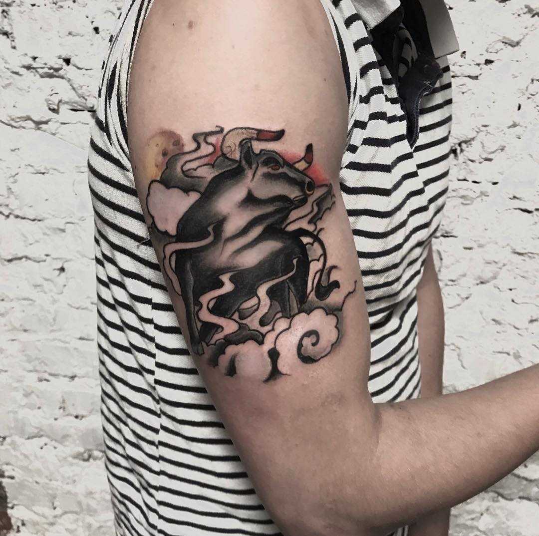 Бык, готовящийся атаковать и нанести ущерб, как правило, изображается с опущенной головой, заостренными рогами и подогнутой ногой. Это одно из самых популярных тату для Тельца мужчины. Данный рисунок – это воплощение силы и мощи, которое показывает мужественность в ее полном смысле.