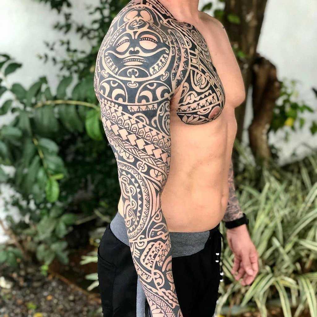 Если на руке изображена прямая линия, такой рисунок означает воинский путь. Поэтому если при выборе орнамента учитывается его значение, в котором есть упоминание воинского пути мужчины, то лучше всего носить тату маори на плече. Так же, на руку можно нанести, тату Полинезия в виде рукава: такой дизайн смотрится наиболее эффектно.
