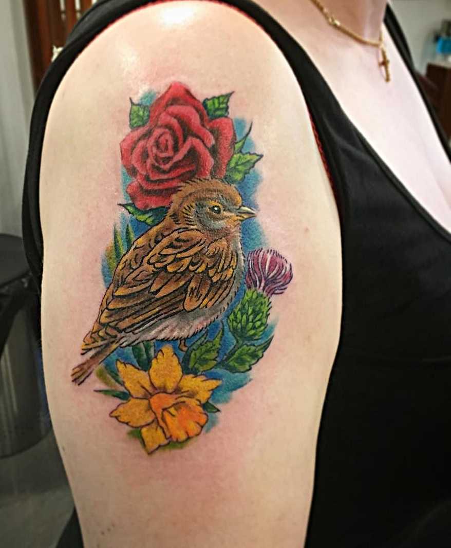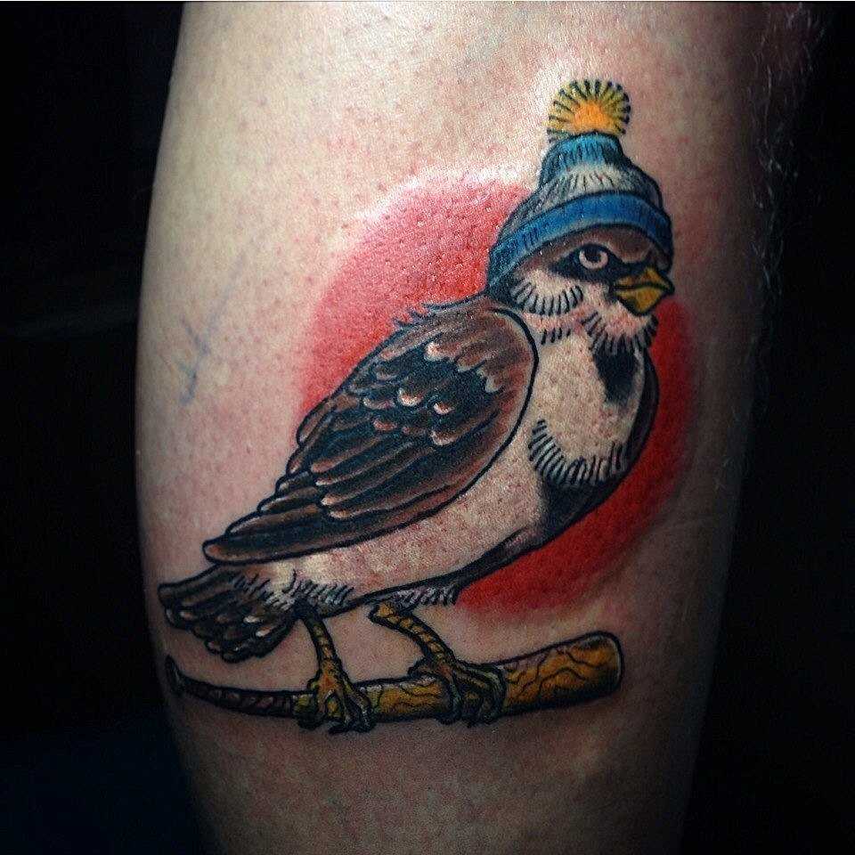 Эти маленькие, активные птицы очень популярны в технике олдскул. Часто тату с изображением воробья сопровождают, значимой для человека, фразой или цитатой.