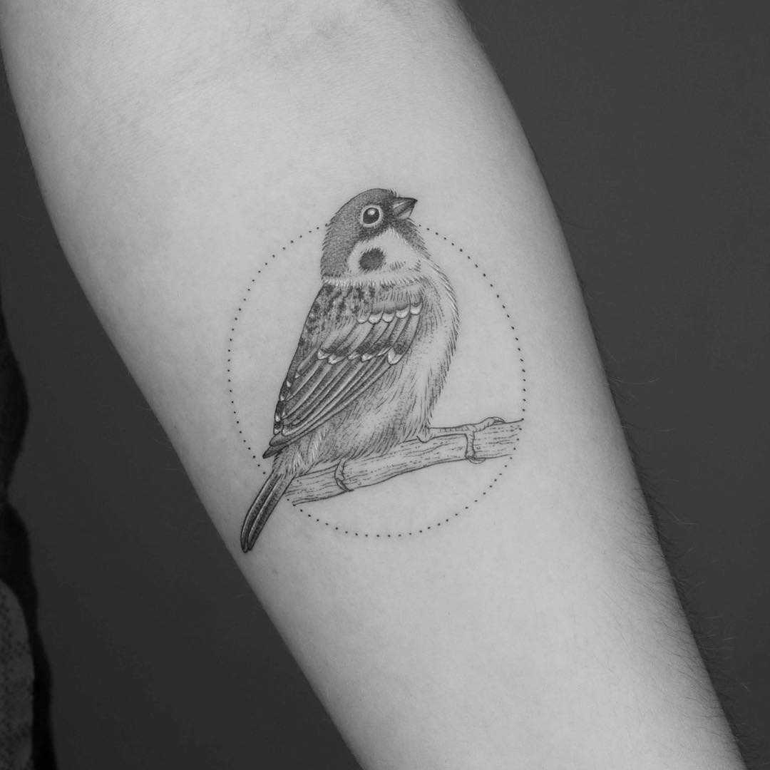 Дотворк – точечная техника нанесения, в которой интенсивность цвета зависит от расстояния между точками, имеющими различный диаметр. Тату воробей в таком стиле наиболее подходит для отважных и открытых людей, жаждущих показывать наколку находящимся вокруг.