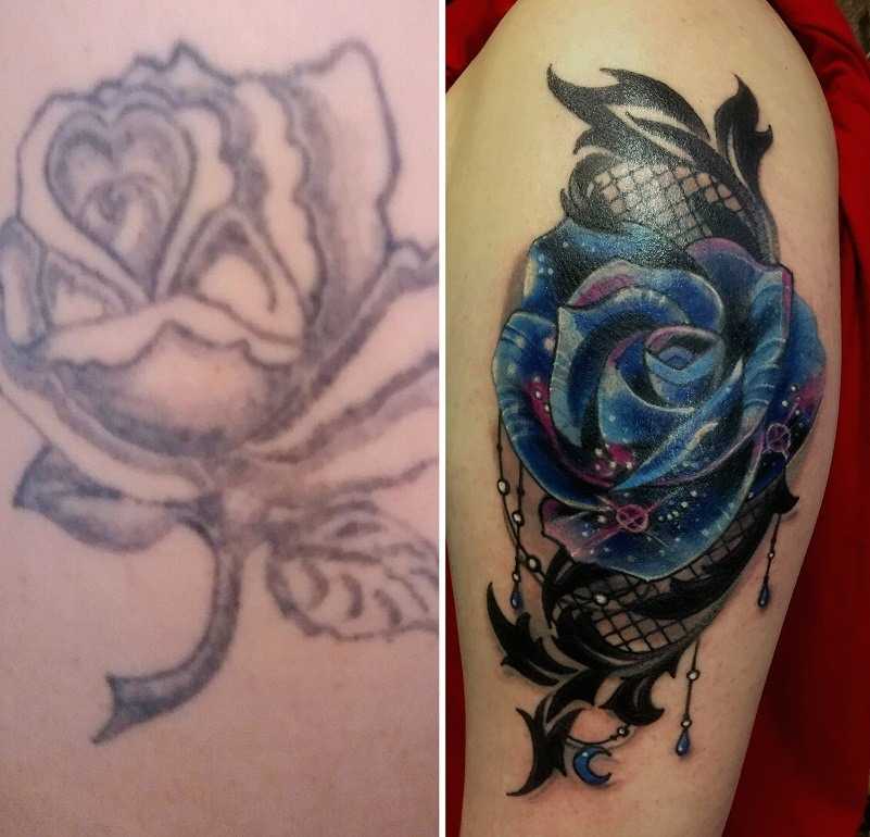 Перекрыть чёрную татуировку жёлтым просто невозможно. Тёмный цвет проступит через некоторое время некрасивой грязной кляксой. Чёрный нательный рисунок перекрывается только другим чёрным изображением. На синюю краску следует накладывать аналогичный цвет. Те же правила актуальны и для красного. Если перекрытию подлежит выцветшая или светлая татуировка, то это значительно облегчит поставленную задачу. В этом случае в работе могут быть использованы любые белее насыщенные или тёмные пигменты. Также следует понимать, что новая татуировка будет иметь большие размеры, чем предыдущий эскиз.